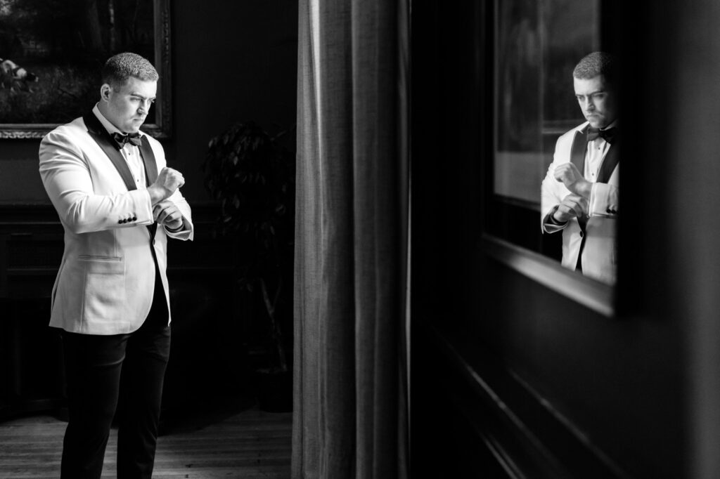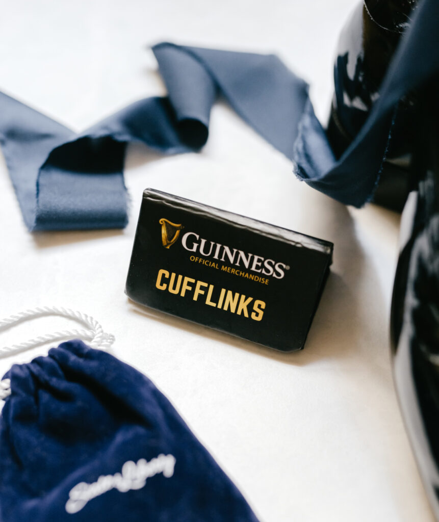 Meanwhile, Conor and the guys brought a timeless energy—black tuxedos, easy banter, and Conor in a sharp white dinner jacket that balanced formal with fun. And then there were the personal touches: Guinness cufflinks gifted by his groomsman Mike, a small detail that felt quietly sentimental—exactly the kind of thing you’re grateful to have documented later.