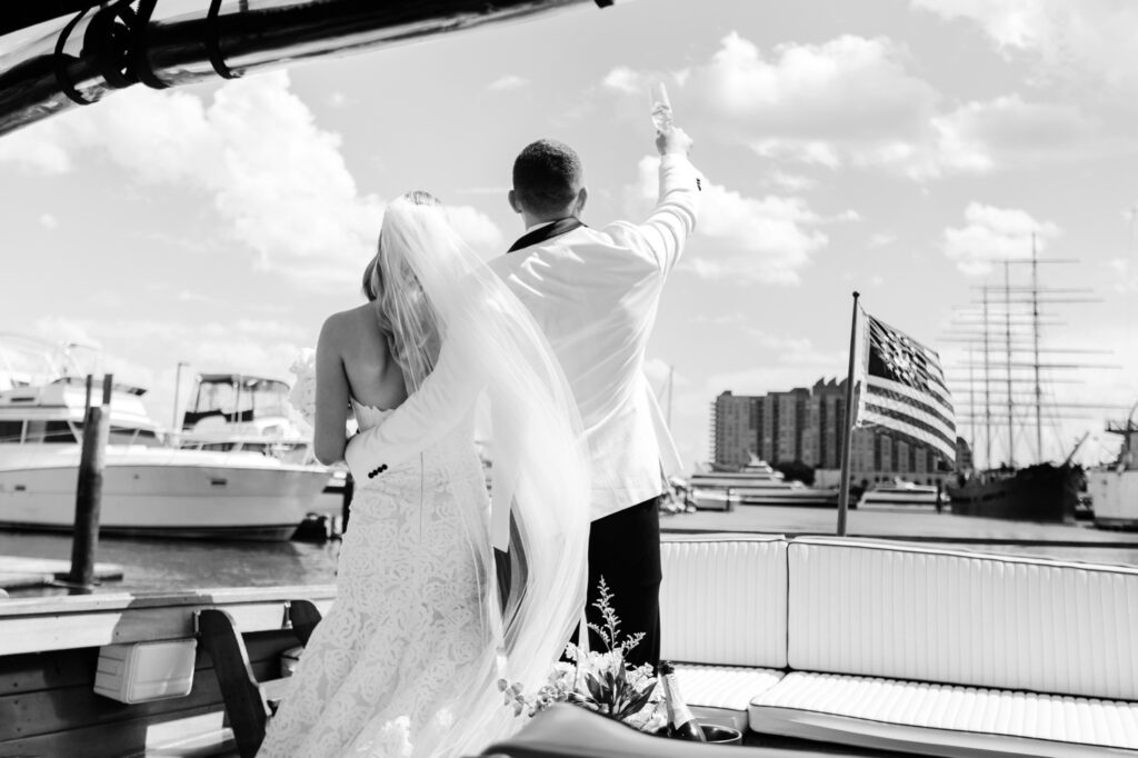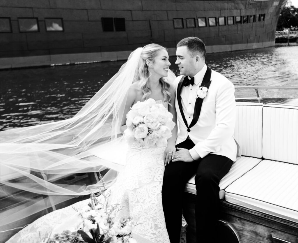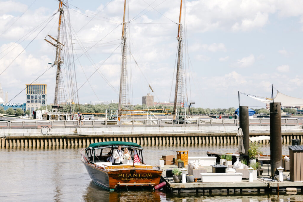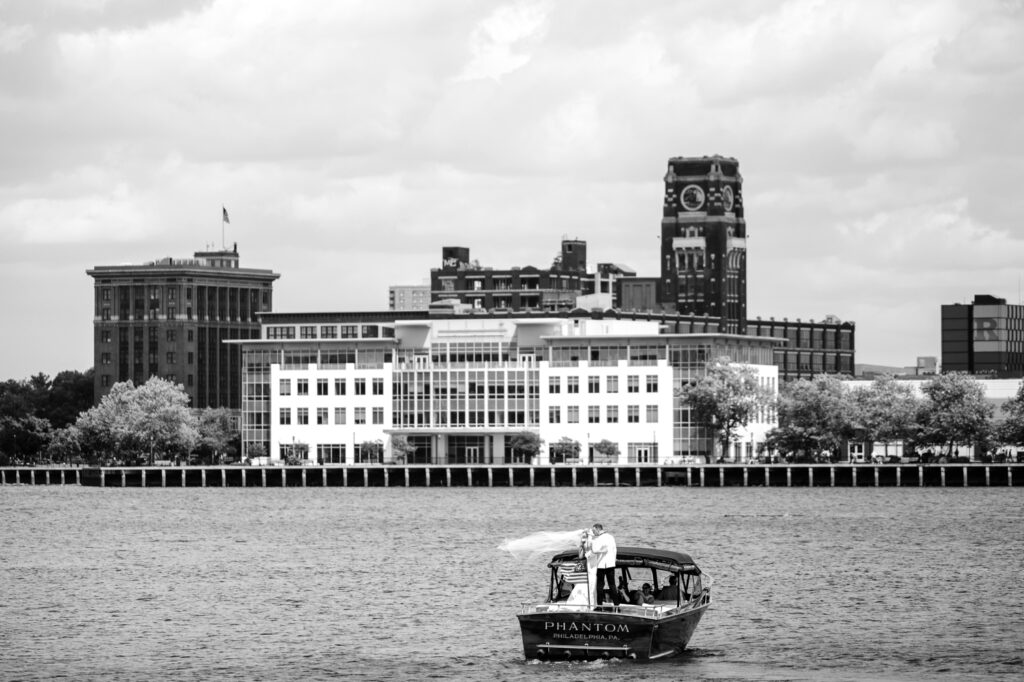 From there, they boarded Phantom, a classic wooden boat from Sea Philly—polished teak, timeless lines, and the kind of charm that feels reminiscent of the Italian Riviera. Out on the water, they shared a bottle of champagne, soaking in a quiet pause together before the day gathered speed again. Cruising the Delaware with the Ben Franklin Bridge in the background gave their portraits a clean, editorial feel—nautical, refined, and modern. Gregg captured drone footage during this time, and the sweeping perspective of the boat gliding along the river is exactly the kind of visual storytelling that makes film such a beautiful complement to photography.