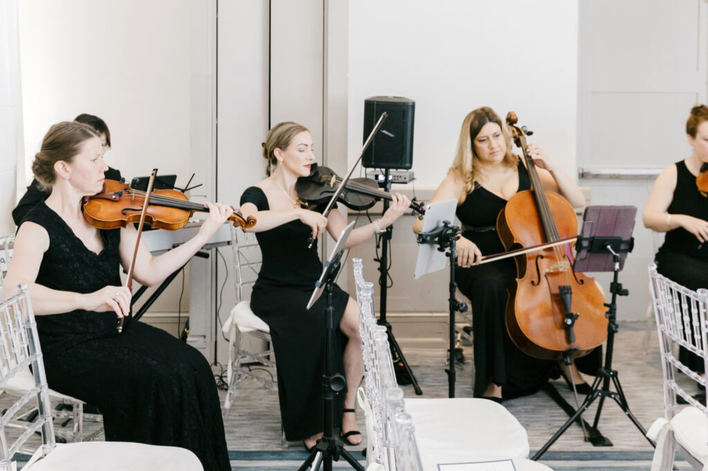 Their ceremony space was a study in light and texture—layers of sheer white draping, soft illumination, and an aisle framed with white florals and candlelight that made the entire room feel dreamlike. What began as a hotel conference space was reimagined into something romantic and refined. Philly Wedding Lighting handled the draping and lighting that gave the room its glow, while Andrea Levine Artists set the tone with ceremony music that felt timeless and full of feeling.