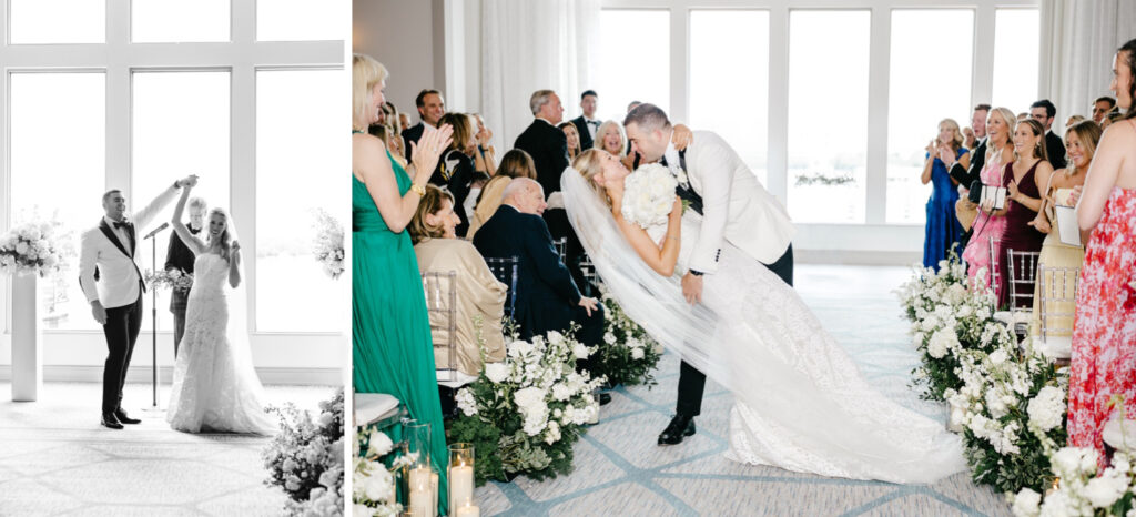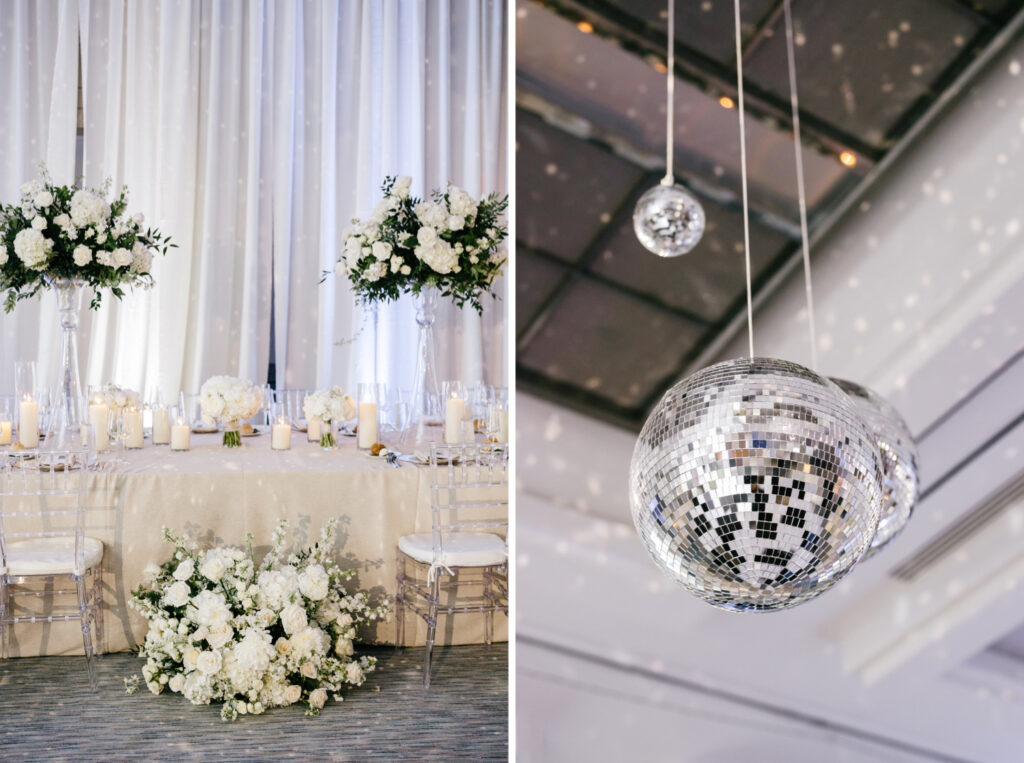 As guests entered the reception, the energy shifted decisively—from waterfront elegance to high-glam celebration. Ivory linens and lush greenery set the stage, but it was the disco balls overhead, reflective silver details, and candlelight bouncing across the room that transformed the space into something bold, vibrant, and unmistakably ready to party. The room felt alive—confident, dynamic, and designed for movement.