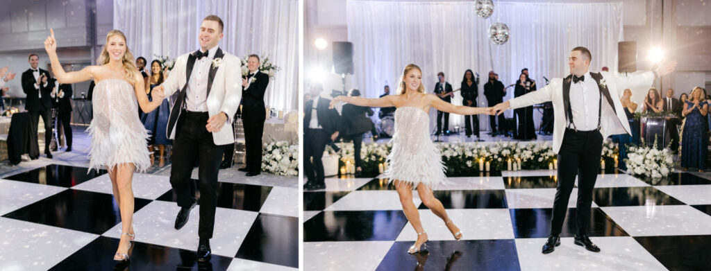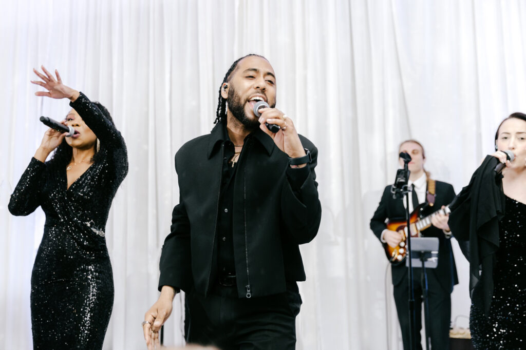 Olive Street Events led the planning and design with a clear vision for how the evening would unfold, creating a reception that felt like a true second act rather than a continuation. Working alongside her, The Stem’s End layered the room with refined white-and-greenery florals that softened the space without dulling the glamour, while Philly Wedding Lighting elevated everything with draping and lighting that amplified every reflective surface. Party Rental Ltd provided tabletop rentals that kept the look polished and intentional—sleek, silvery, and beautifully balanced. One of the most striking visual moments followed soon after: the ice sculpture “cake.” Unexpected and sculptural, it felt less like dessert and more like a statement, perfectly echoing the disco-ball glow and high-glam energy that defined the night.
