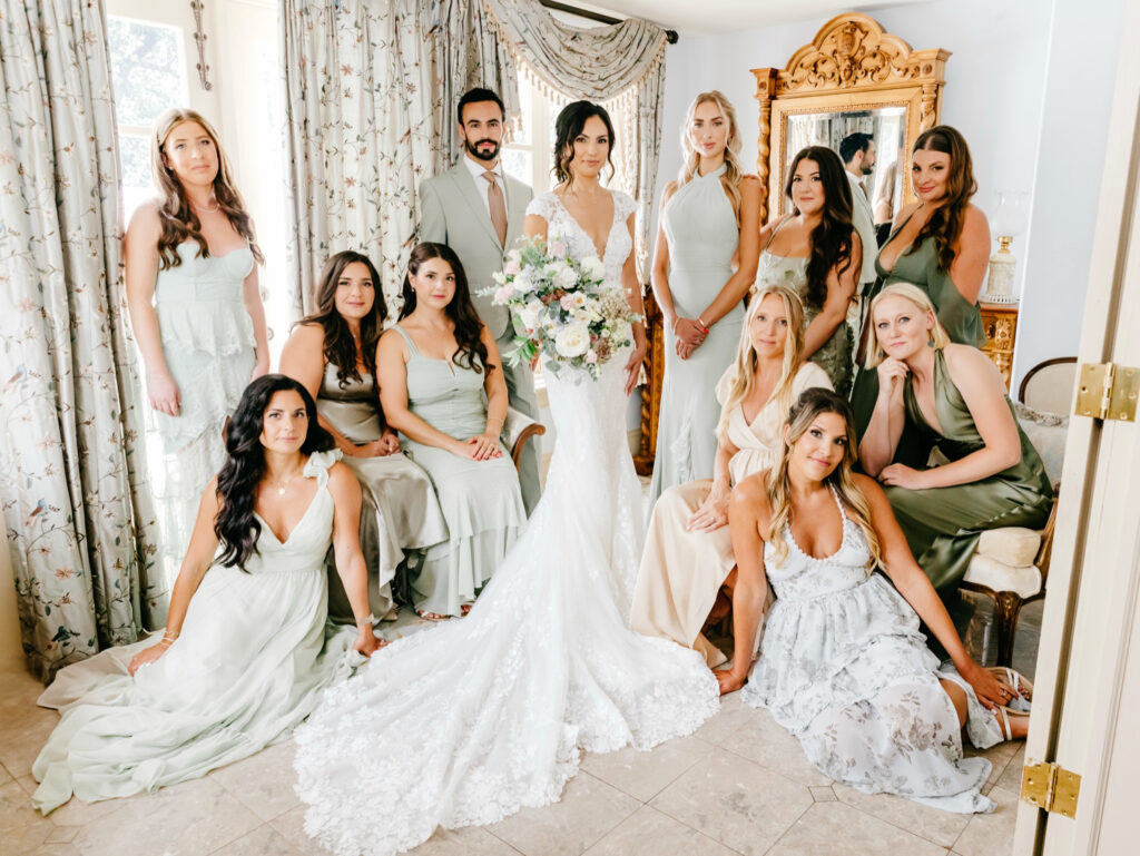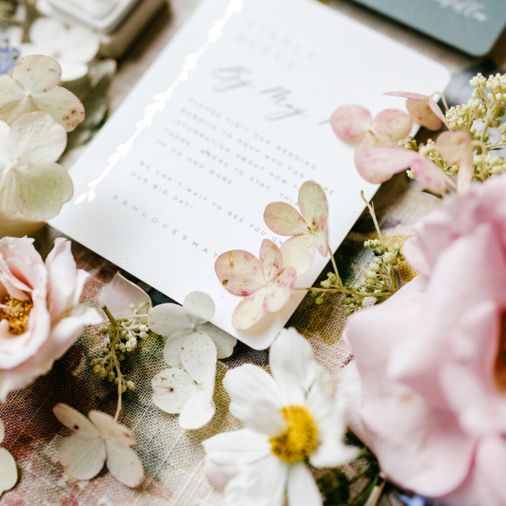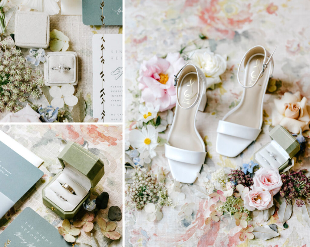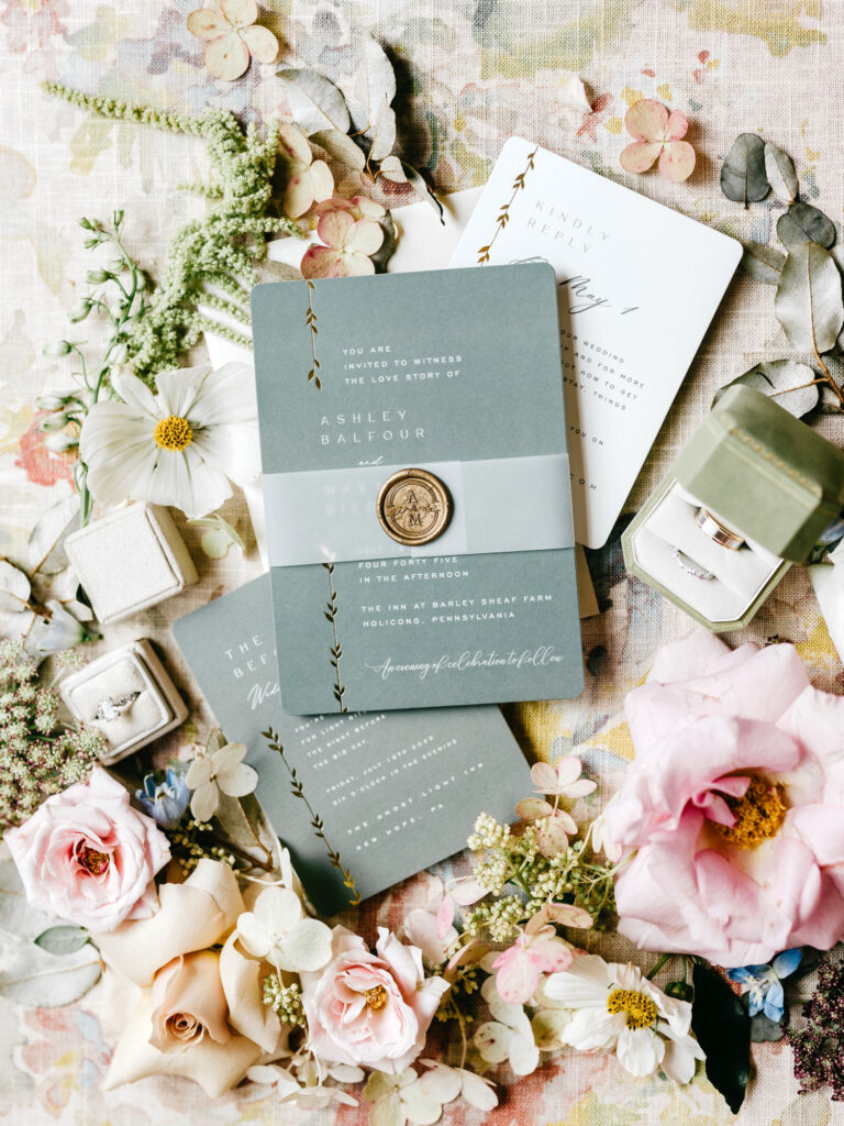 Her invitation suite from Minted reflected the spirit of the celebration—romantic and refined, with a palette that echoed the surrounding gardens. Styled alongside soft florals and textured linens, the paper goods felt fully at home in the setting.