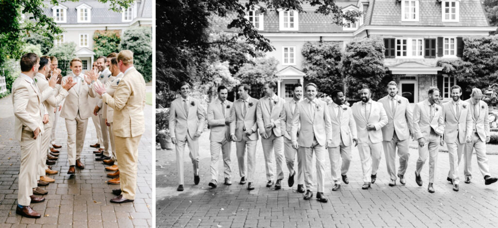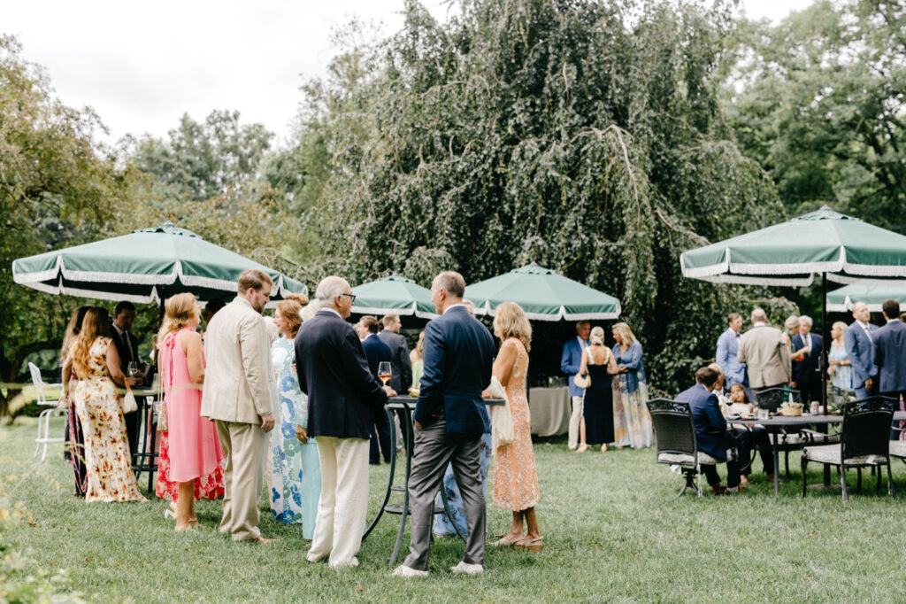 Cocktail hour unfolded on the back patio of the Inn, where guests gathered along the lawn framed by manicured boxwood gardens and mature trees offering dappled summer shade. The setting encouraged an easy rhythm—guests mingling across the patio, conversations carrying through the gardens, and the estate grounds fully coming into view as the afternoon softened into evening.