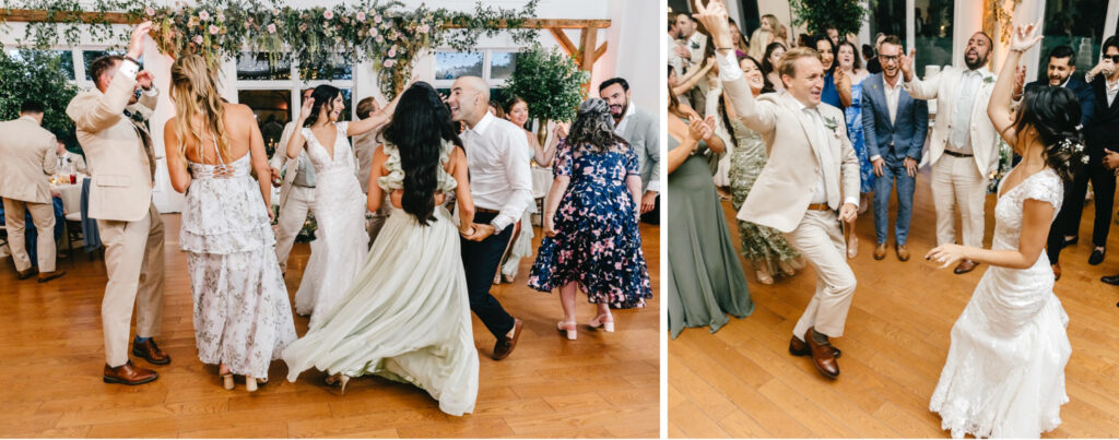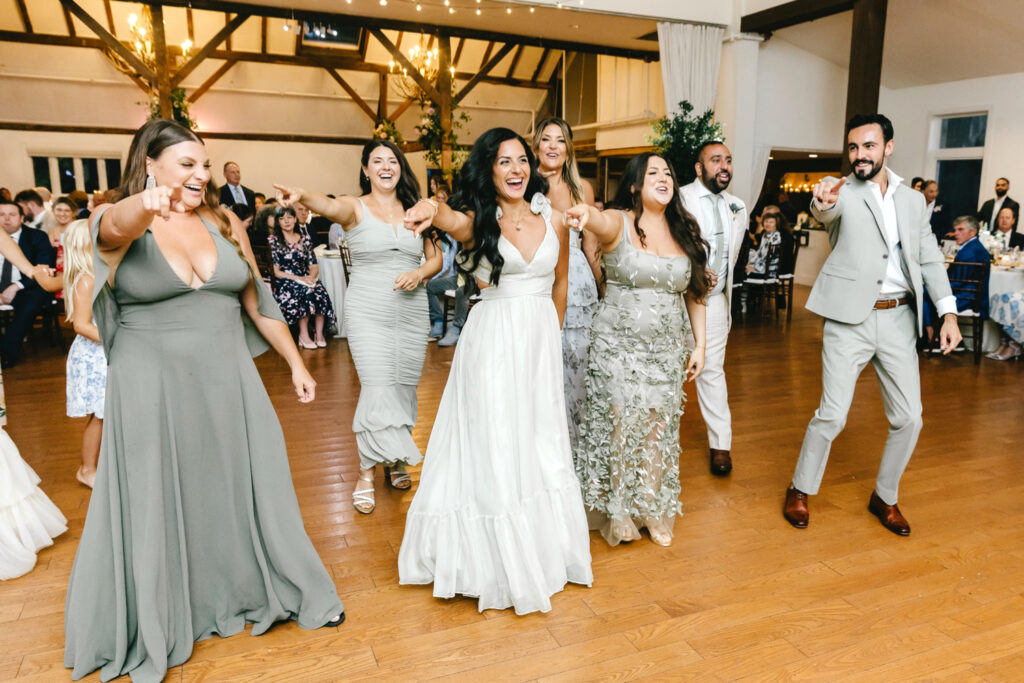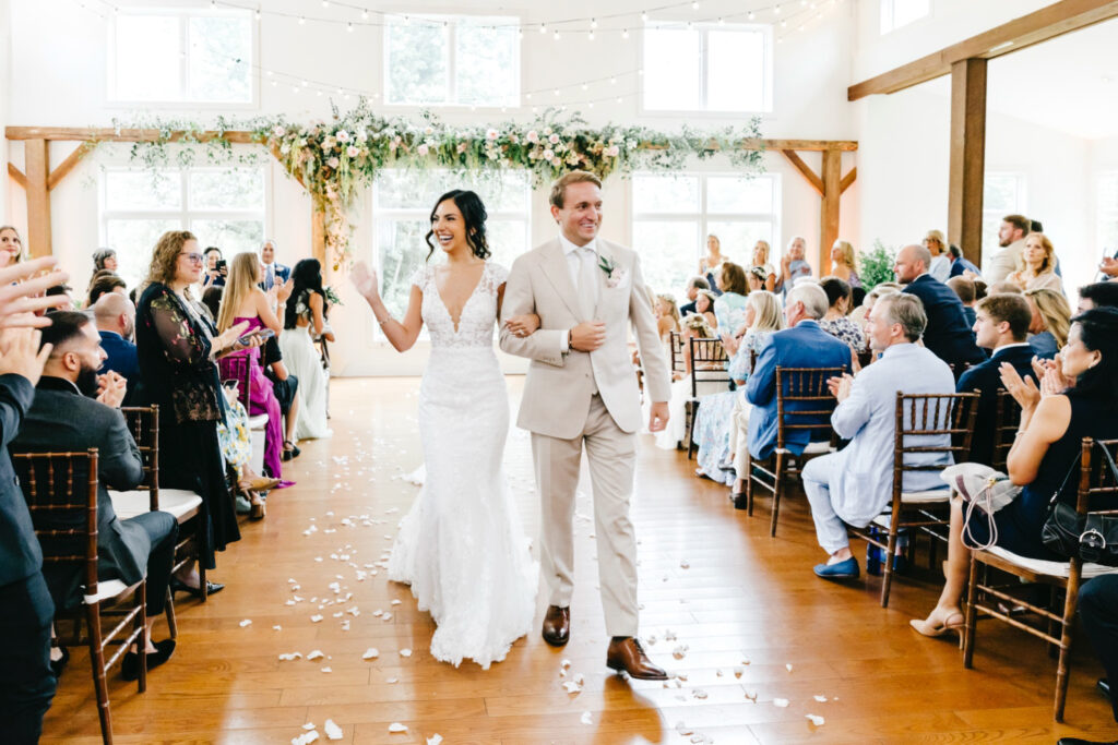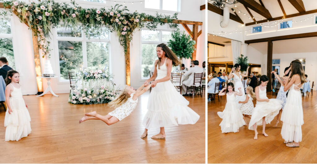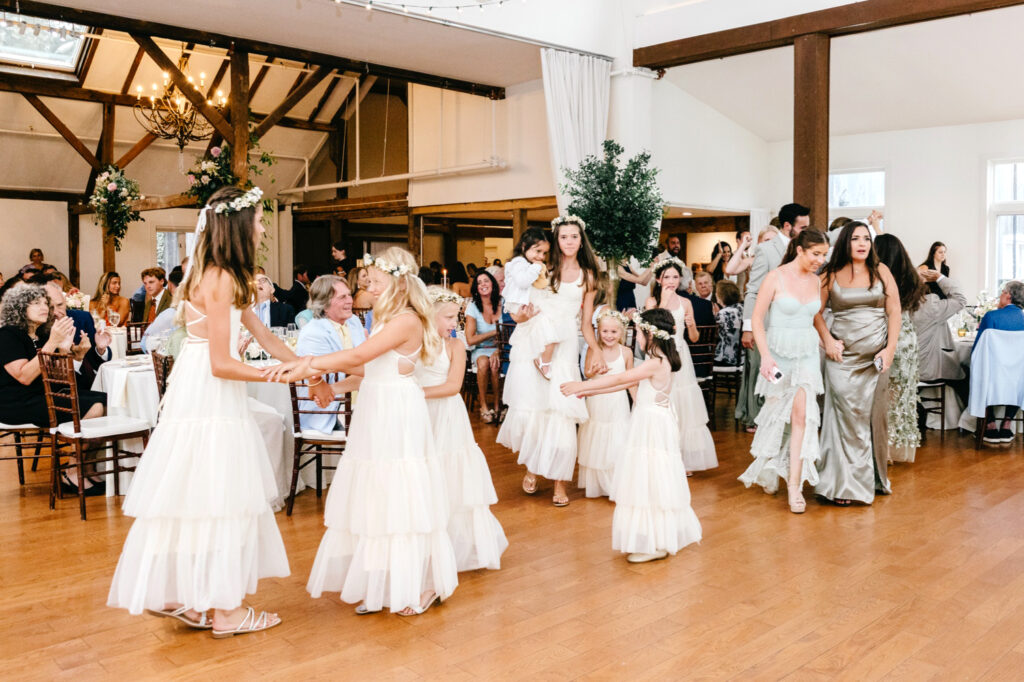 The ceremony itself was full of warmth and joy. Eight flower girls made their way down the aisle, filling the space with movement and anticipation, followed by guests showering the aisle with flower petals as Ashley and Matthew recessed together. Laughter and tears moved easily through the room as they shared personal vows, creating a moment that felt immersive and heartfelt. The barn’s light, scale, and thoughtful floral design supported the energy of the ceremony so naturally that it never read as a secondary option—it felt like a beautiful, intentional setting for a celebration that was already unfolding with ease.