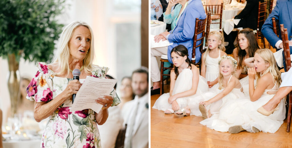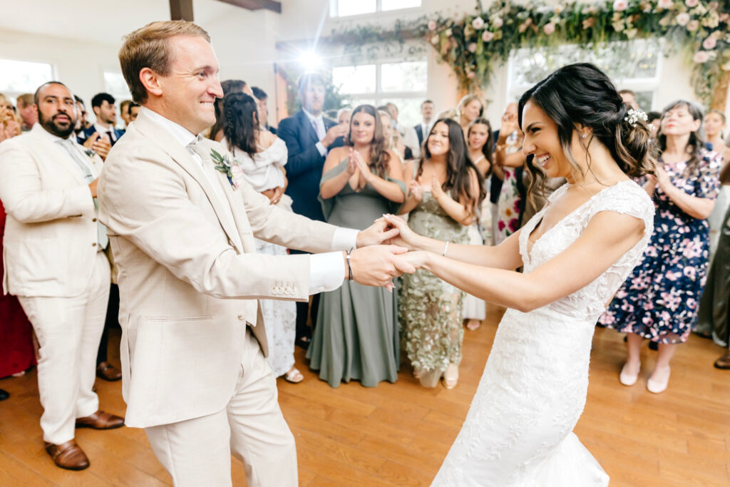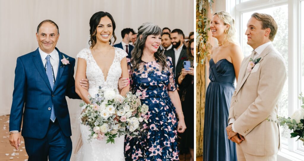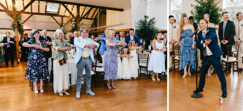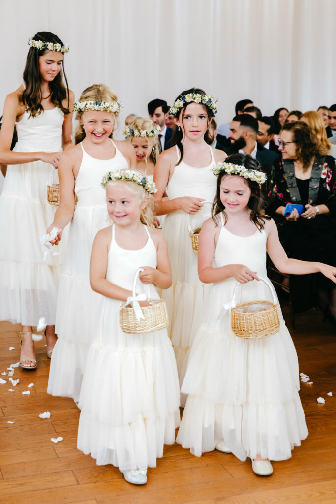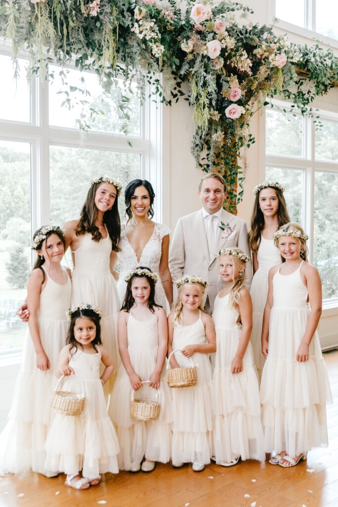 The ceremony itself was full of warmth and joy. Eight flower girls made their way down the aisle, filling the space with movement and anticipation, followed by guests showering the aisle with flower petals as Ashley and Matthew recessed together. Laughter and tears moved easily through the room as they shared personal vows, creating a moment that felt immersive and heartfelt. The barn’s light, scale, and thoughtful floral design supported the energy of the ceremony so naturally that it never read as a secondary option—it felt like a beautiful, intentional setting for a celebration that was already unfolding with ease.