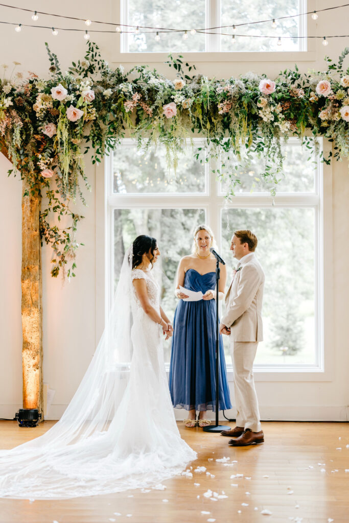 Due to the summer heat and the possibility of storms, the ceremony was held inside the barn—an easy and elegant transition that felt completely at home within the setting. Designed by Sebesta Design, the space was already rich with garden-inspired florals woven along the barn rafters, creating a layered, organic backdrop for the ceremony.