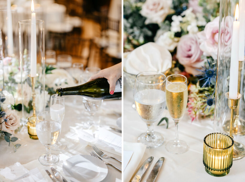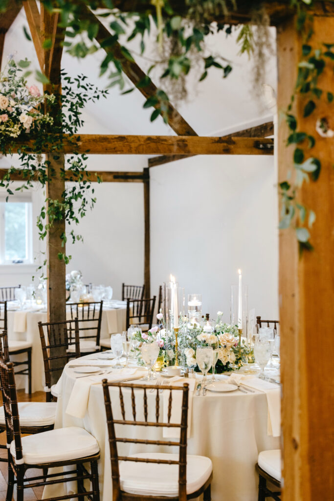 As the celebration moved into the barn for the reception, the space revealed a romantic, garden-forward atmosphere designed by Sebesta Design. English garden–inspired florals filled the room with layered greenery, soft blooms, and natural movement that echoed the landscape outside. Candlelight and thoughtful floral placement brought warmth to the barn’s architecture, creating an inviting environment that felt cohesive with the estate setting. The transition from garden to barn carried the tone of the day forward seamlessly, grounding the evening in beauty, intention, and a strong sense of place.