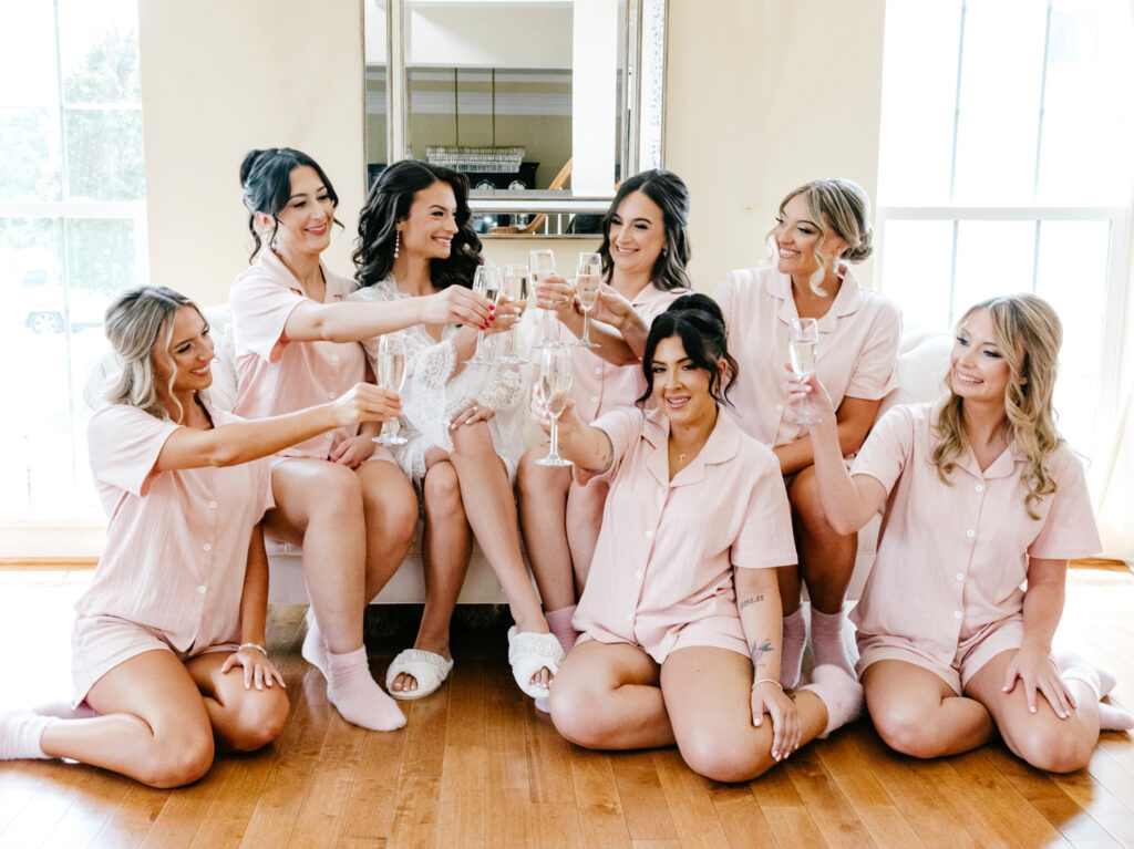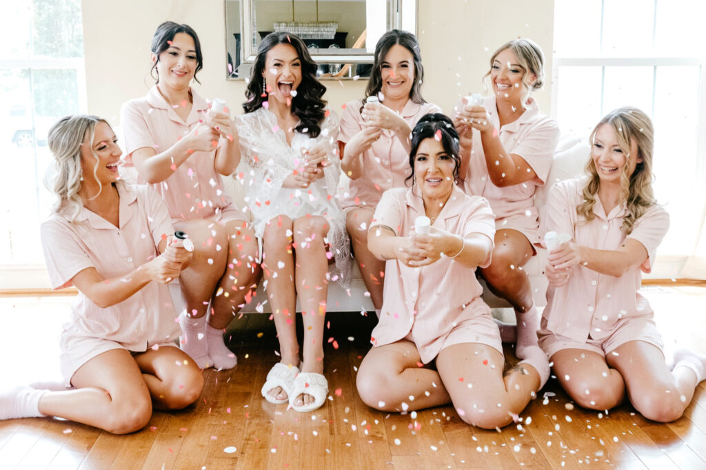 Alexa began her wedding day in her childhood home, surrounded by her sisters, bridesmaids, and the people who know her best. The morning felt relaxed and full—laughter in the rooms, soft light filtering through familiar windows, and a brand-new niece passed lovingly from arm to arm. Their family dog made his appearance too, weaving his way through the excitement like he’d been waiting for this day as long as everyone else.
