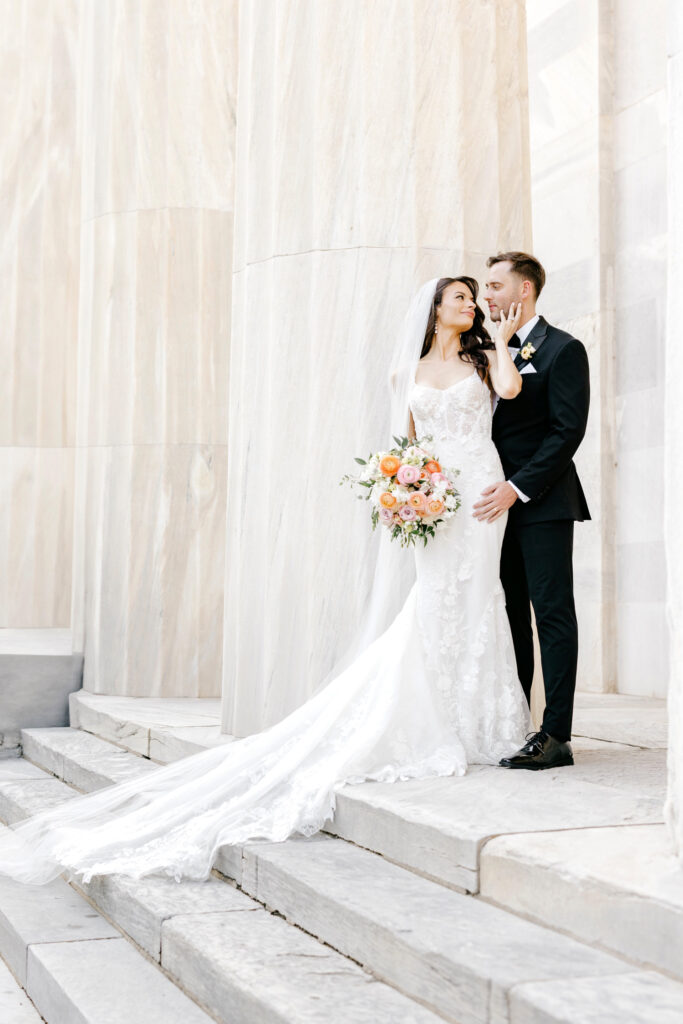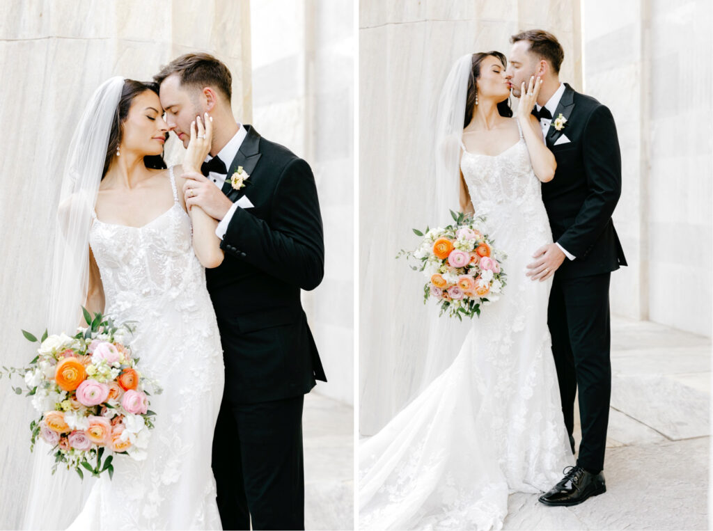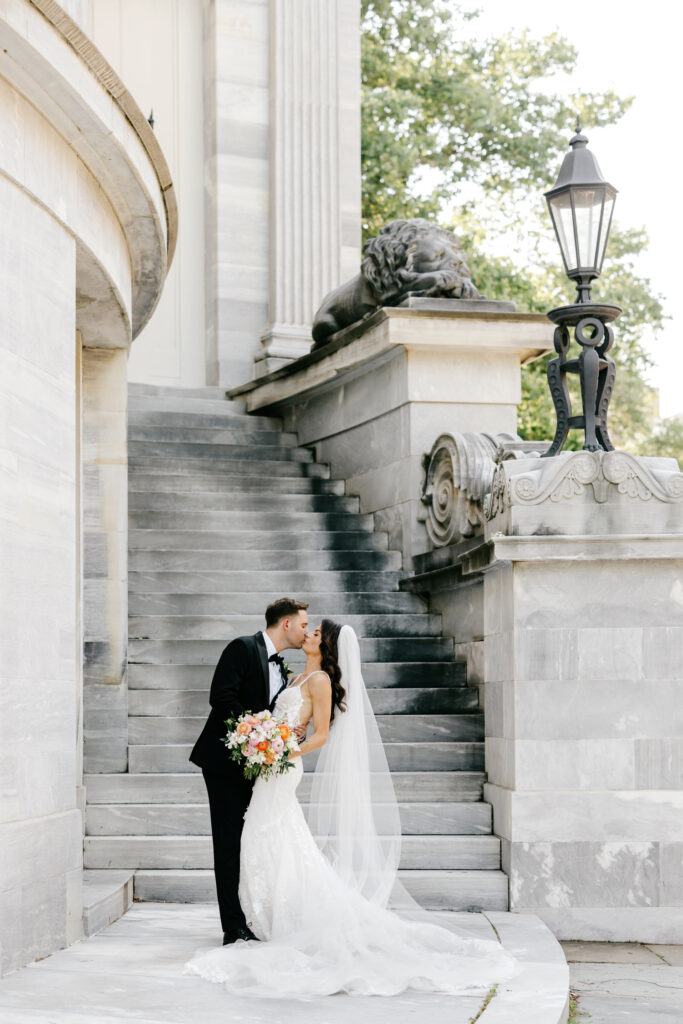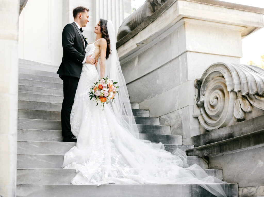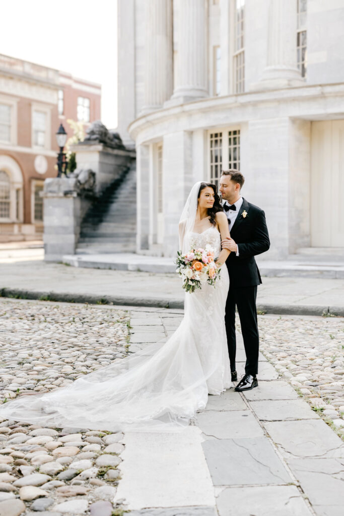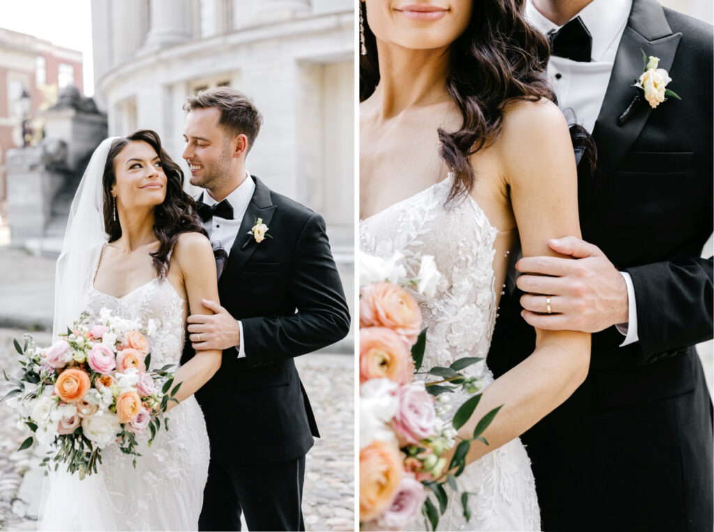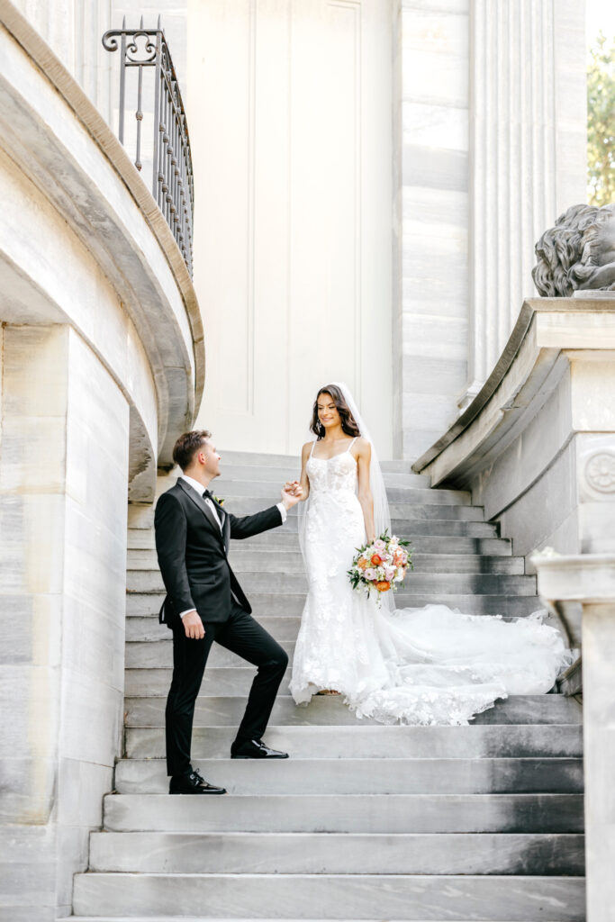 After the ceremony, we headed into the city for portraits at the iconic Merchant’s Exchange & First National Bank Building. The crisp white marble, sweeping columns, and open space created a timeless backdrop that allowed both the architecture and the people within it to shine.
