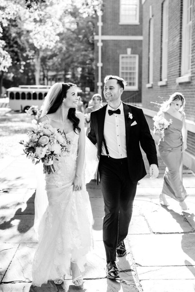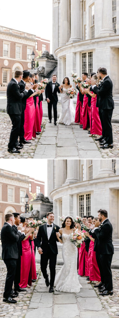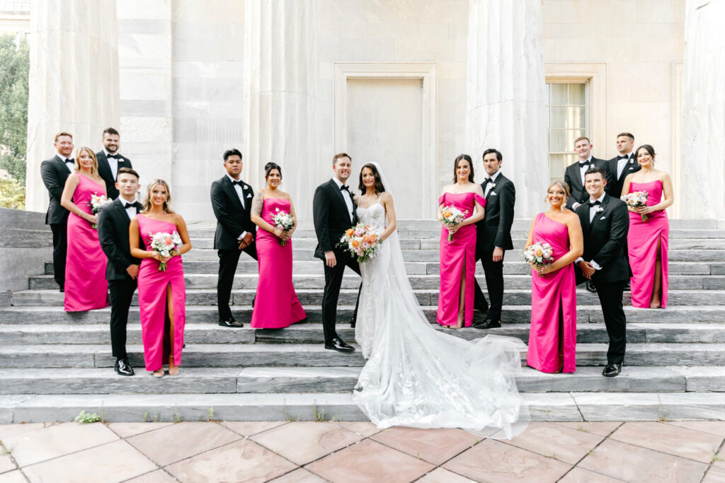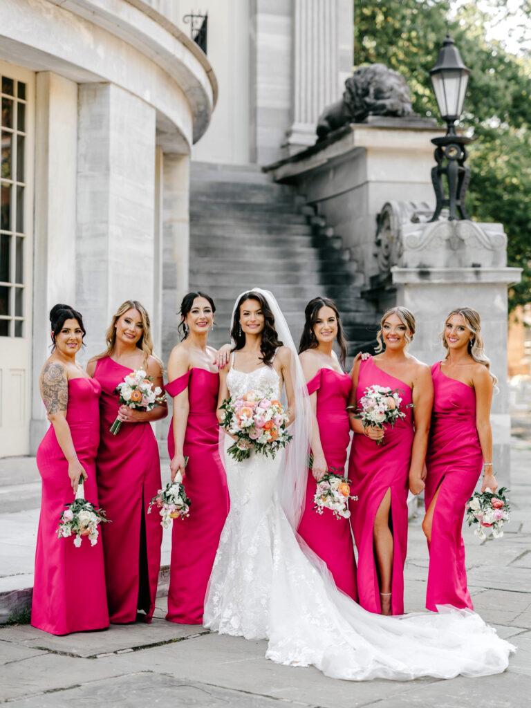 Their bridal party joined in as well, with hot pink silk dresses popping beautifully against the historic architecture. The color brought an energetic, modern edge to the portraits, tying the entire scene back to the bright, summery palette that carried throughout the day. The result felt editorial yet effortless—classic Philadelphia with a vibrant twist.