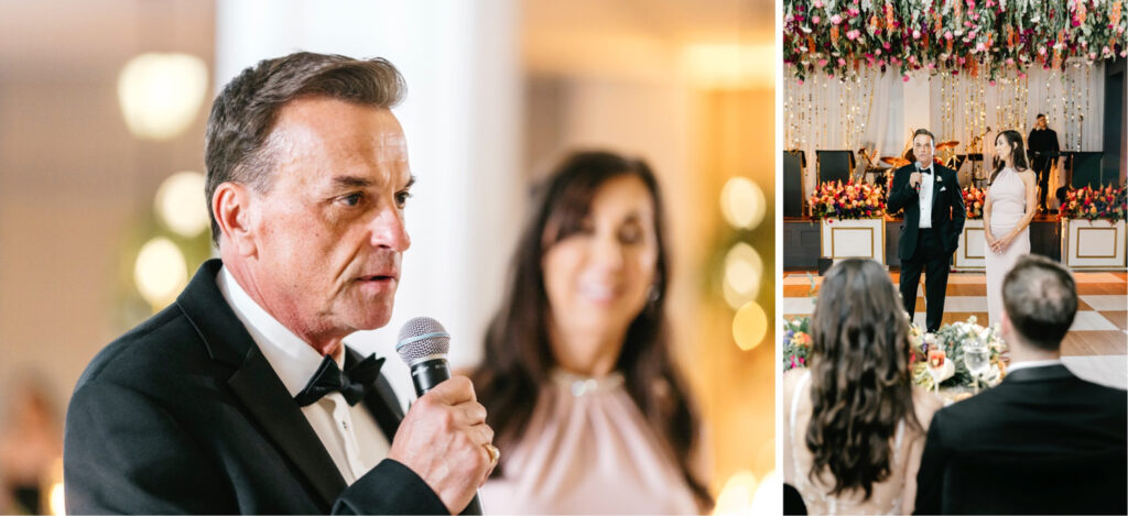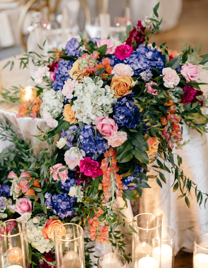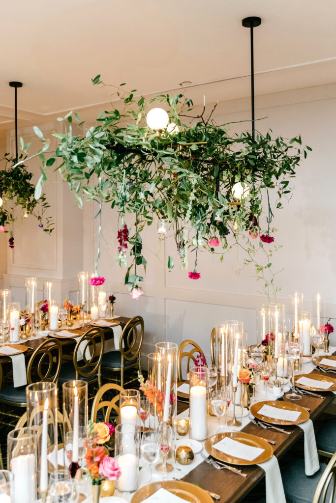 The head table was its own moment entirely, finished with a cascading floral arrangement that spilled forward into a sea of candlelight, creating warmth and intimacy at the center of the room. And above it all, a double-wide installation of hanging florals hovered over the dance floor, nearly covering it completely—transforming the space into a garden-like canopy that moved and shimmered as the night unfolded.