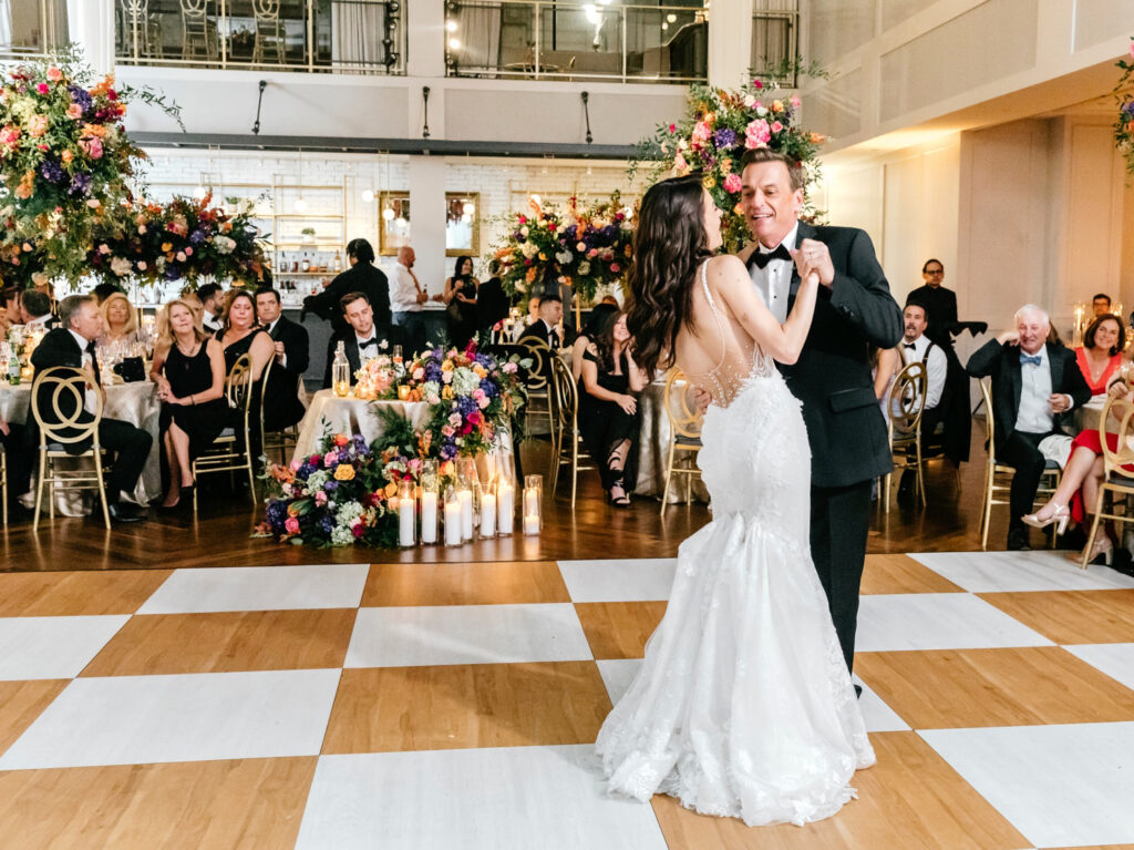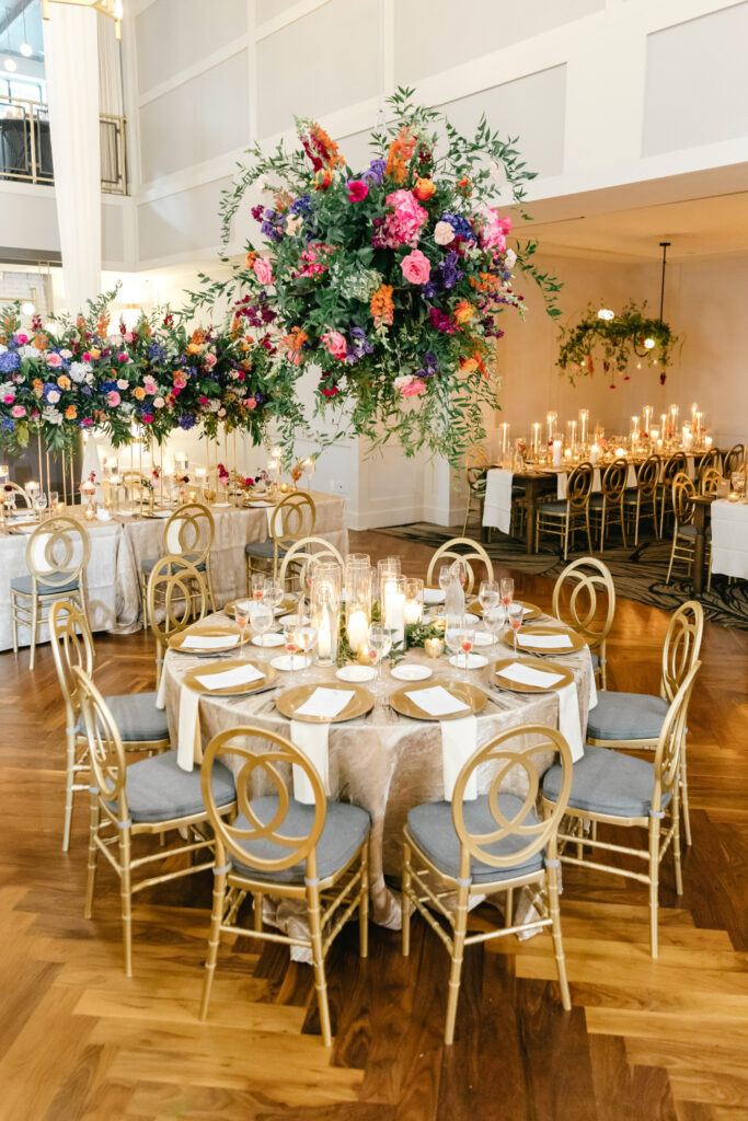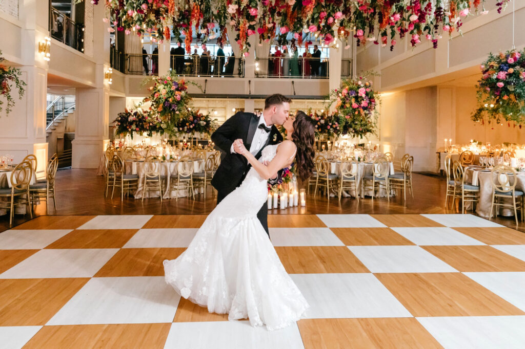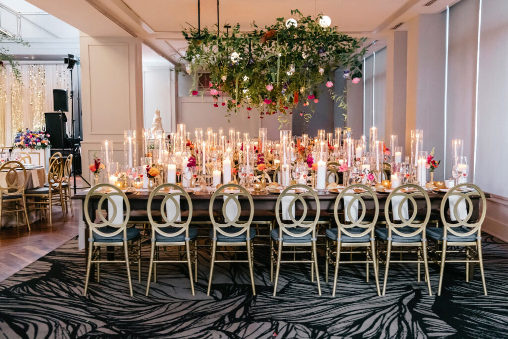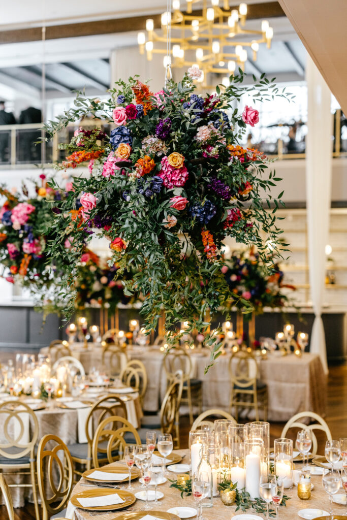 The celebration continued at The Lucy, where the reception design fully embraced color, dimension, and drama. A blonde wood checkerboard dance floor anchored the room, immediately setting a lively, modern tone and inviting guests straight into the heart of the space. Overhead, florals became architecture: large floral spheres were suspended above the round tables rather than perched on tall stands, while long tables were crowned with horizontal, floating arrangements that stretched the length of each setting. The effect was layered and immersive—flowers everywhere you looked, but never competing for attention.