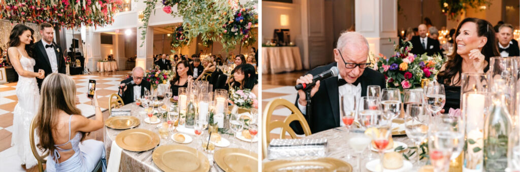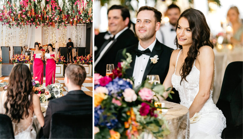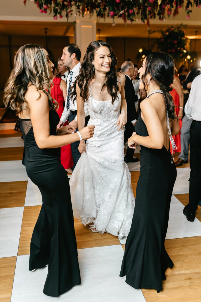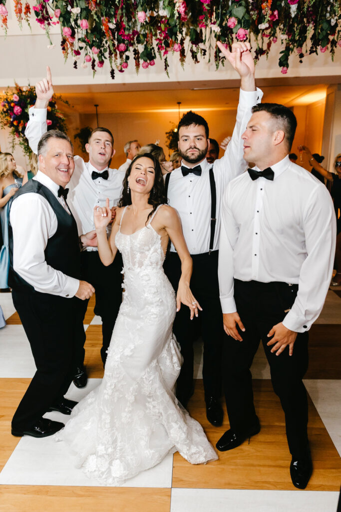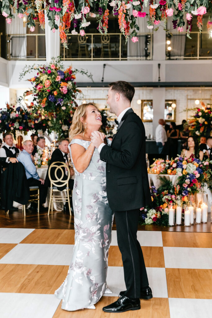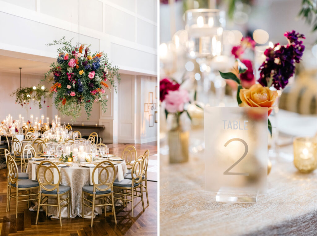 The celebration continued at The Lucy, where the reception design fully embraced color, dimension, and drama. A blonde wood checkerboard dance floor anchored the room, immediately setting a lively, modern tone and inviting guests straight into the heart of the space. Overhead, florals became architecture: large floral spheres were suspended above the round tables rather than perched on tall stands, while long tables were crowned with horizontal, floating arrangements that stretched the length of each setting. The effect was layered and immersive—flowers everywhere you looked, but never competing for attention.