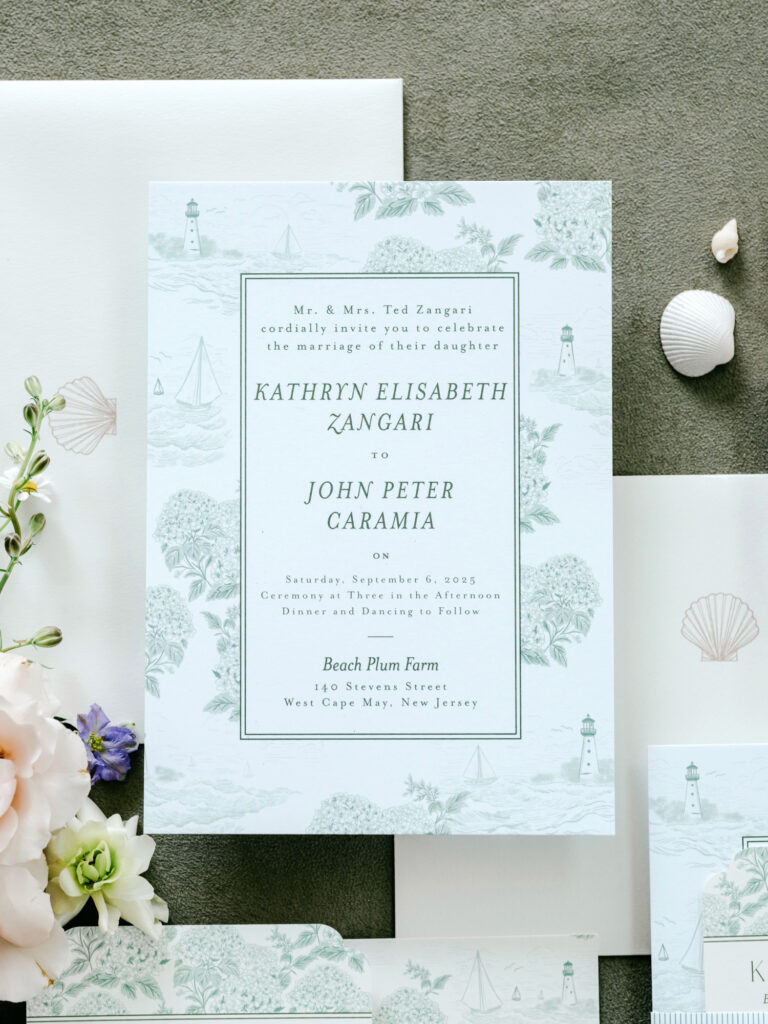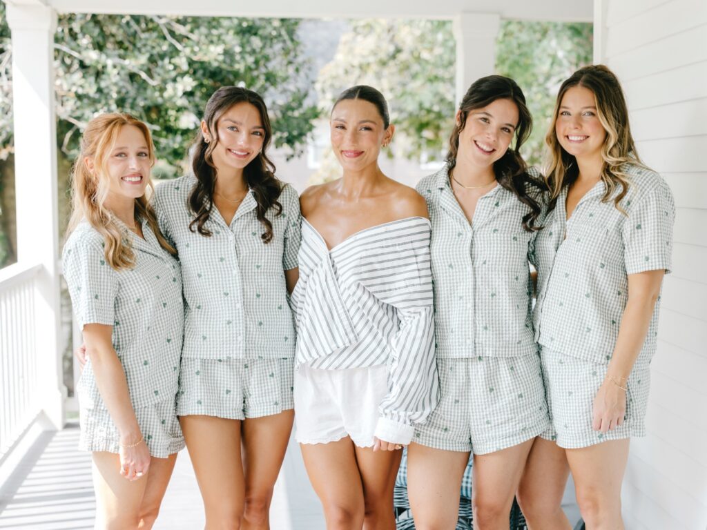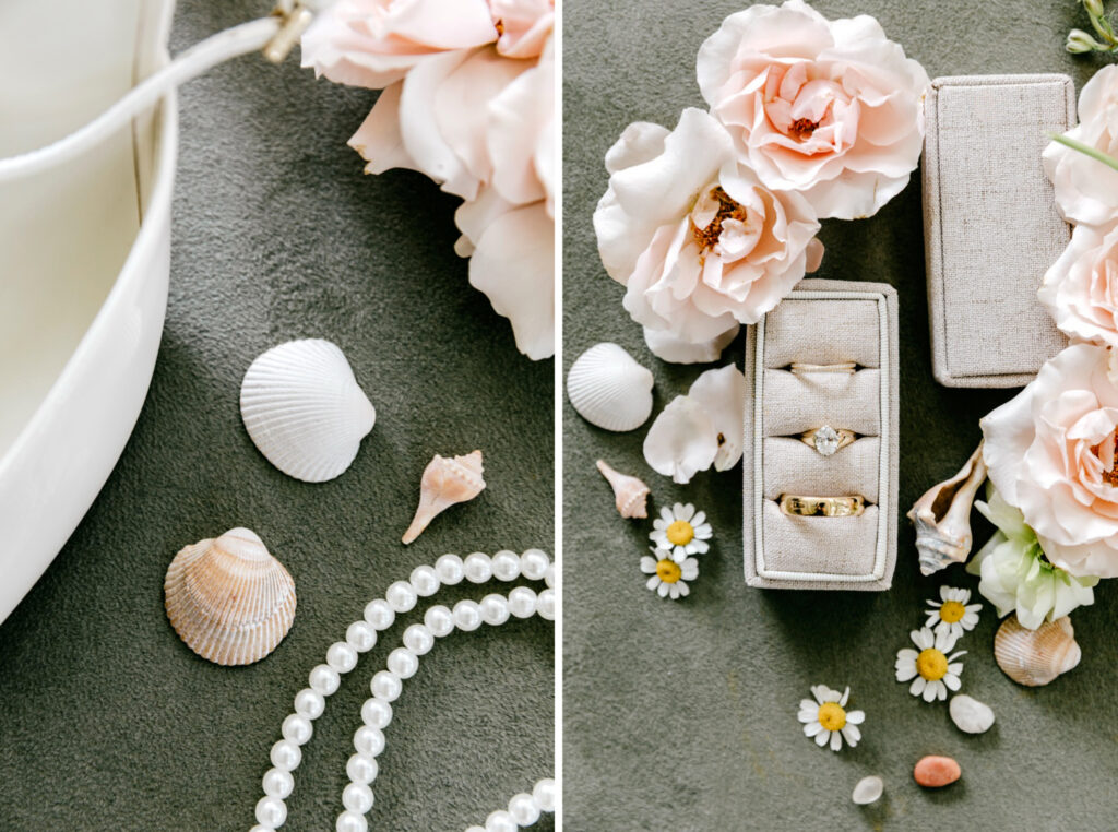 Kat wore a relaxed boyfriend shirt while her bridesmaids gathered around her in matching pajamas, creating a morning that felt easy and joyful. While photographing details, I found a small collection of seashells tucked throughout the cottage and incorporated them into the styling of Kat and John’s invitation suite — a subtle nod to the coastal setting.