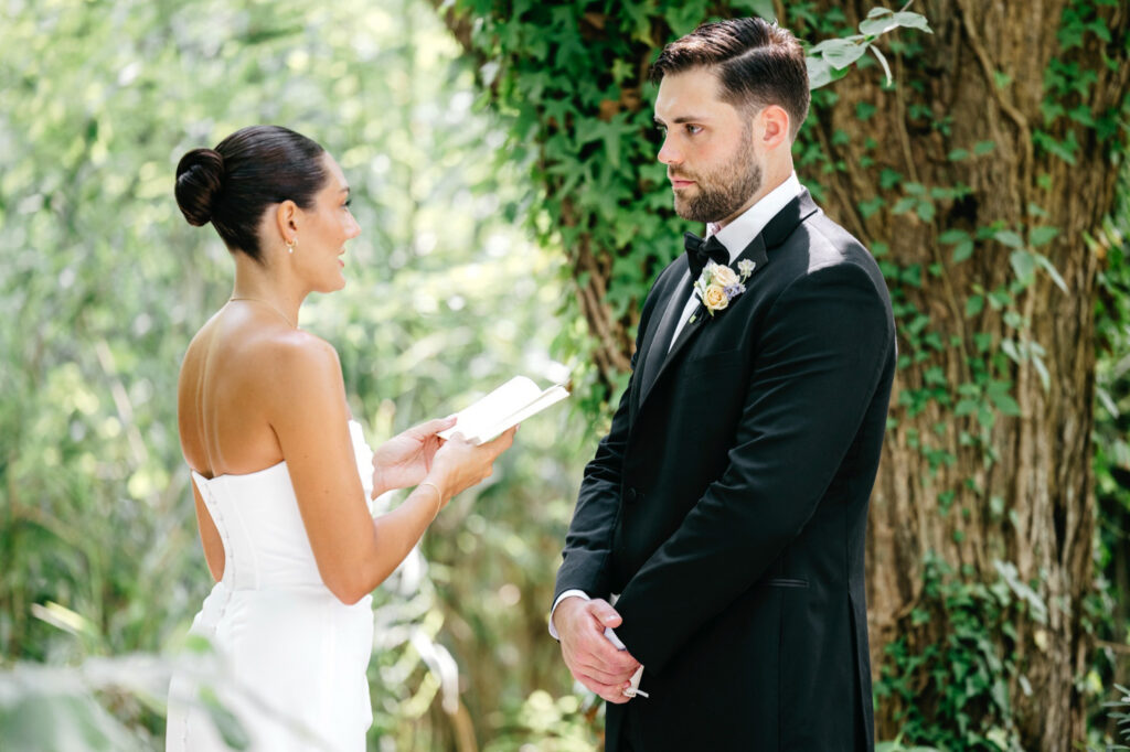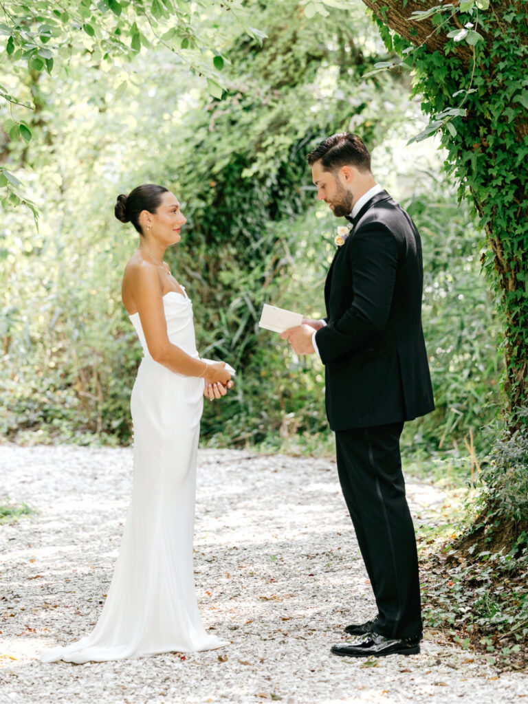 Kat and John chose to share a private first look along the white shell paths that wind through the wooded areas of the property. It was quiet, tucked away, and deeply personal. They read their own vows here, just the two of them, letting the moment breathe before the rest of the day began.