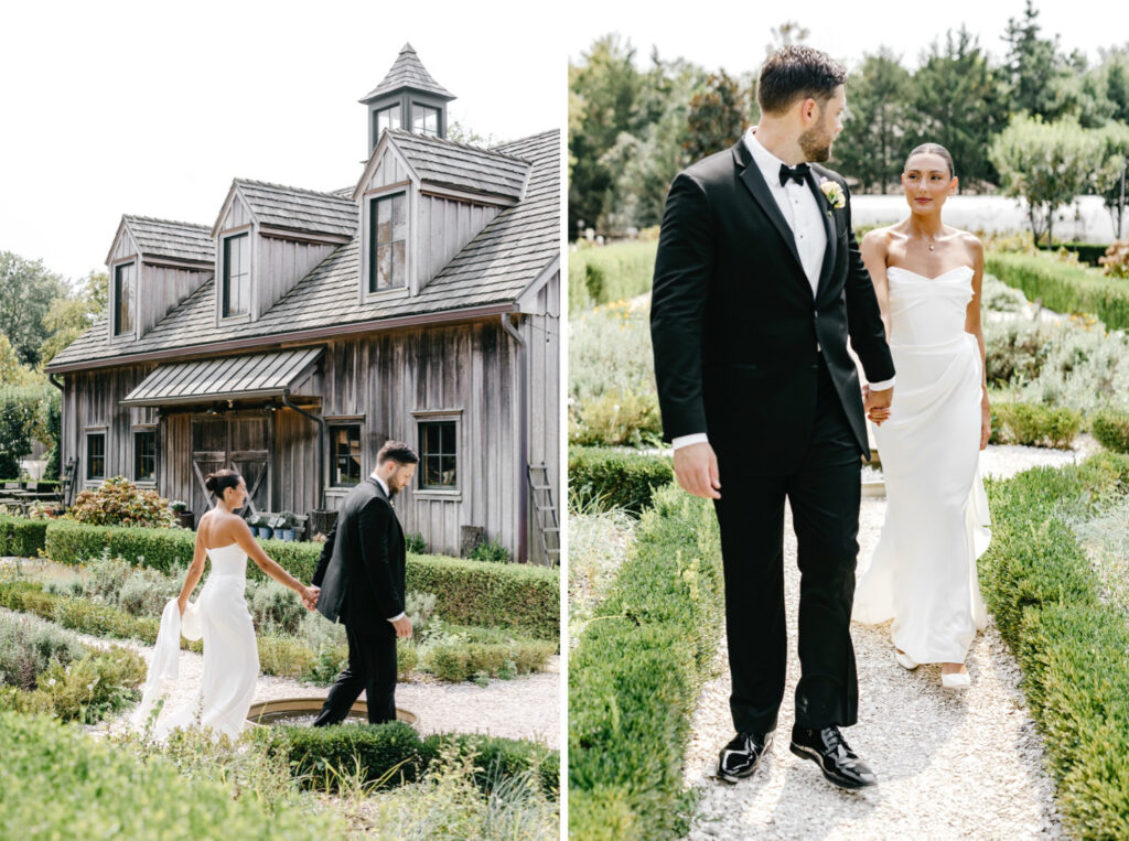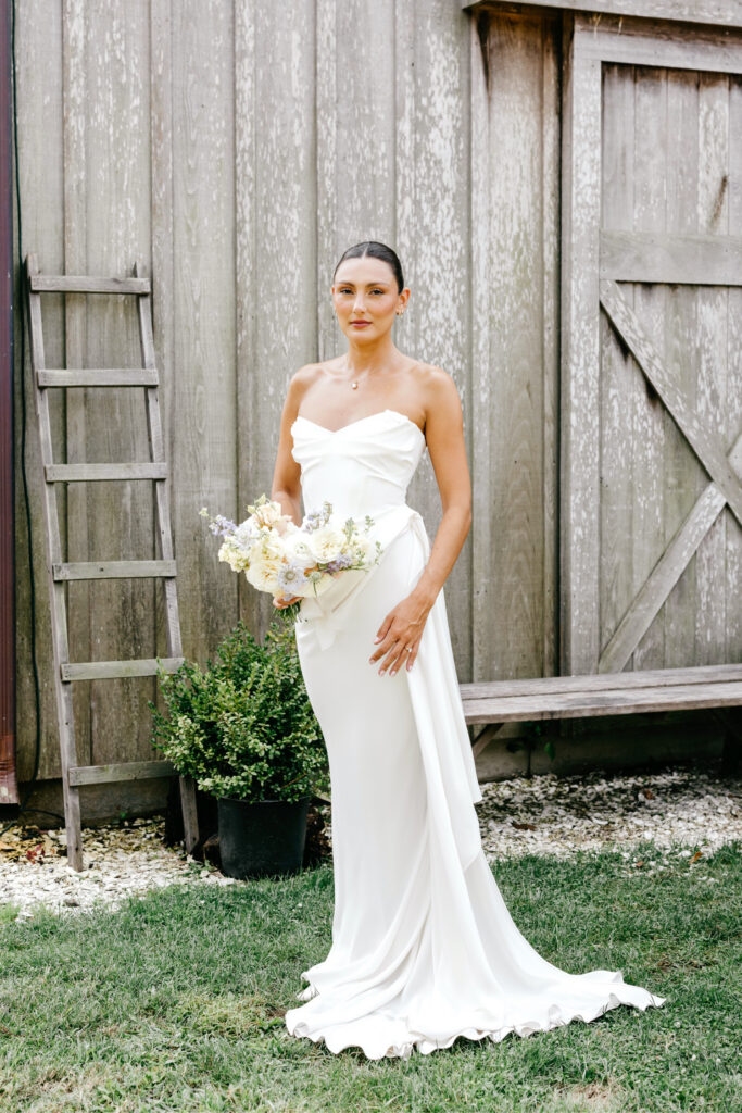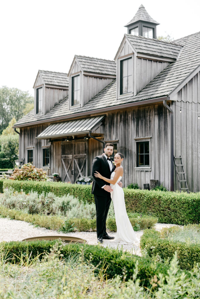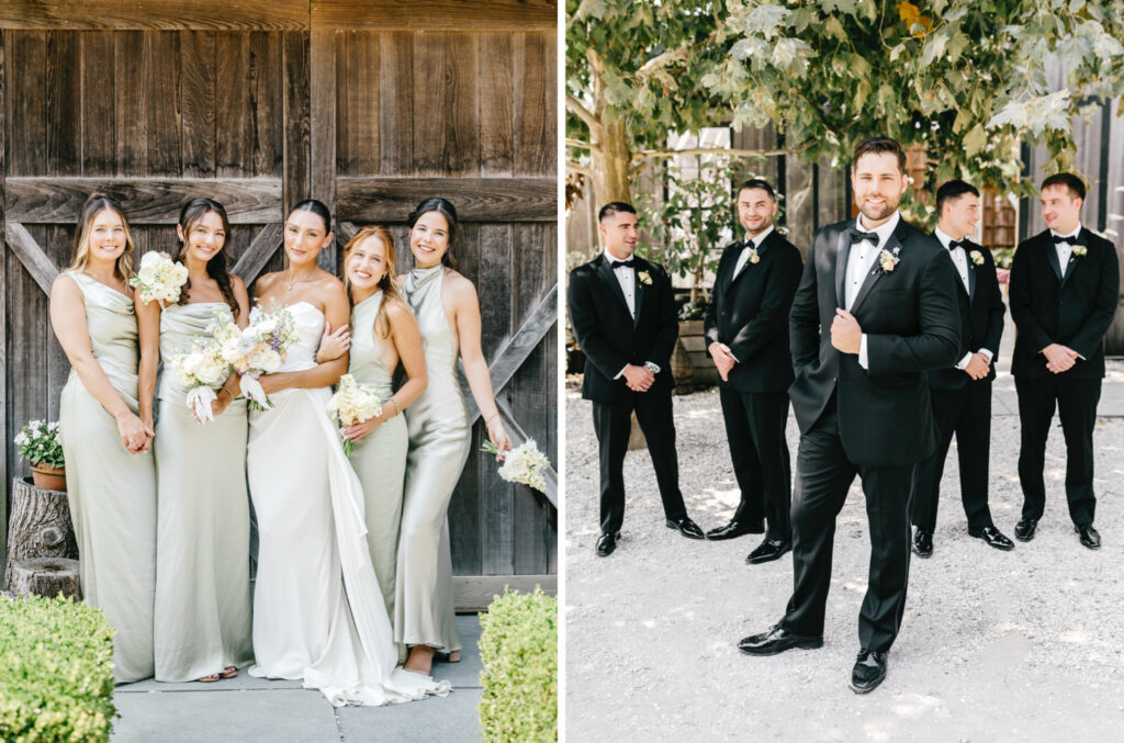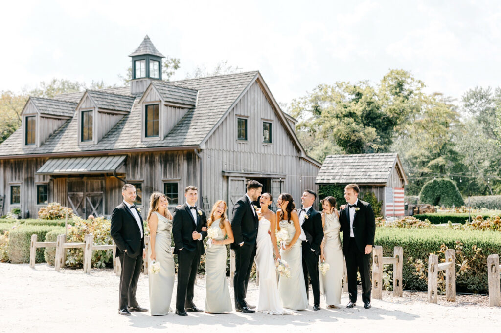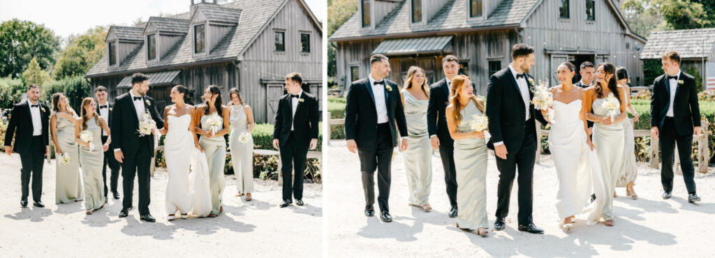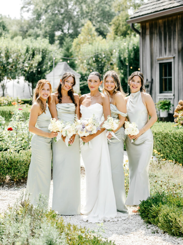 From there, we wandered through the gardens and toward one of the barns, using the herb garden and the weathered barn doors as backdrops. The textures of the farm — aged wood, greenery, and open paths — framed their portraits in a way that felt natural and true to the setting. Kat’s bridesmaids wore a soft sage green that fit seamlessly into the landscape, echoing the tones of the farm without overpowering it.