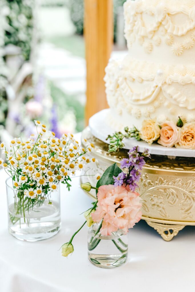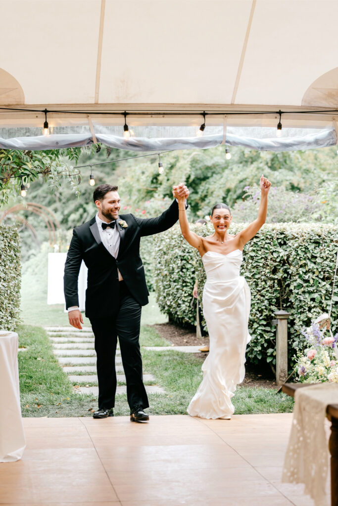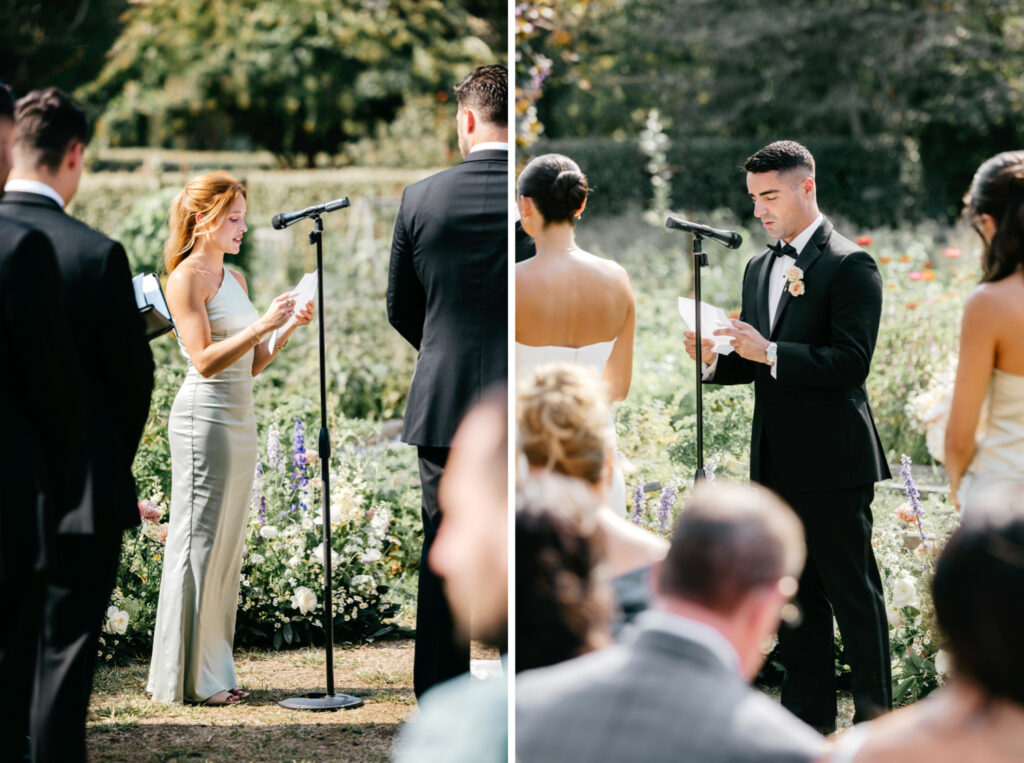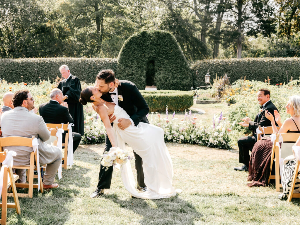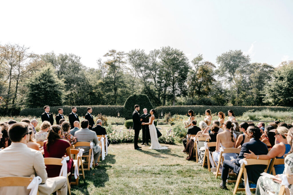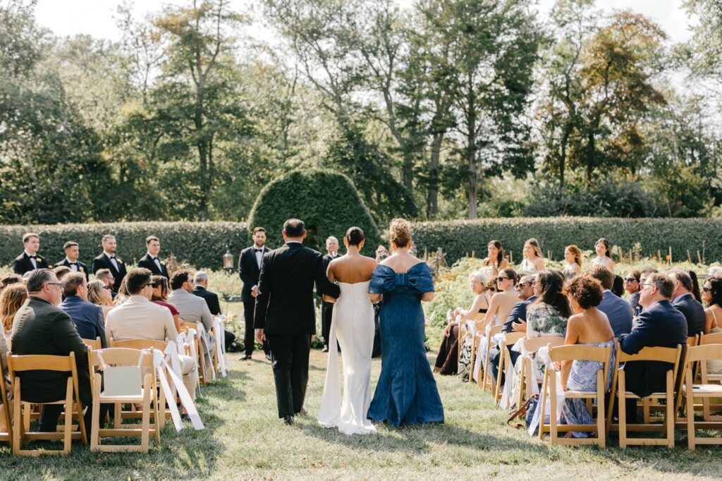The ceremony took place in the garden, where florals by Cape May Flower Co. appeared to grow organically from the ground itself. The arrangements felt integrated into the landscape — airy, textural, and perfectly scaled to the space.