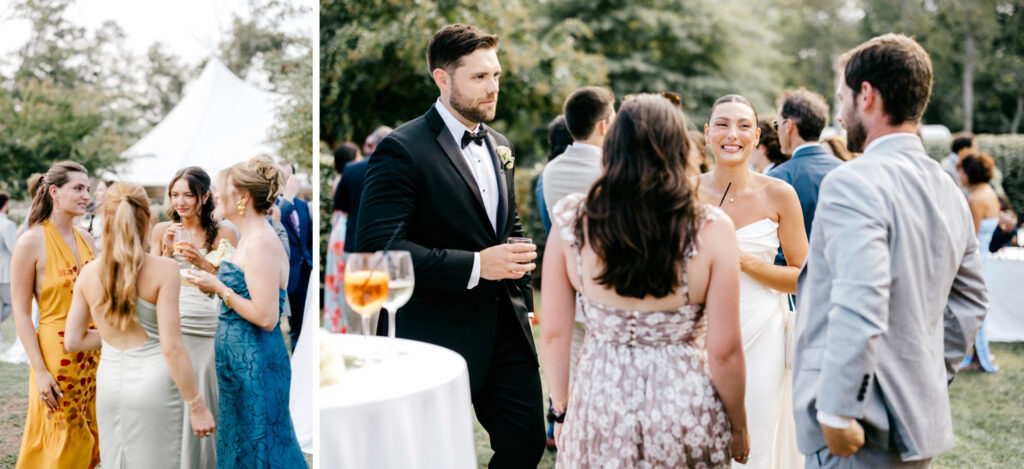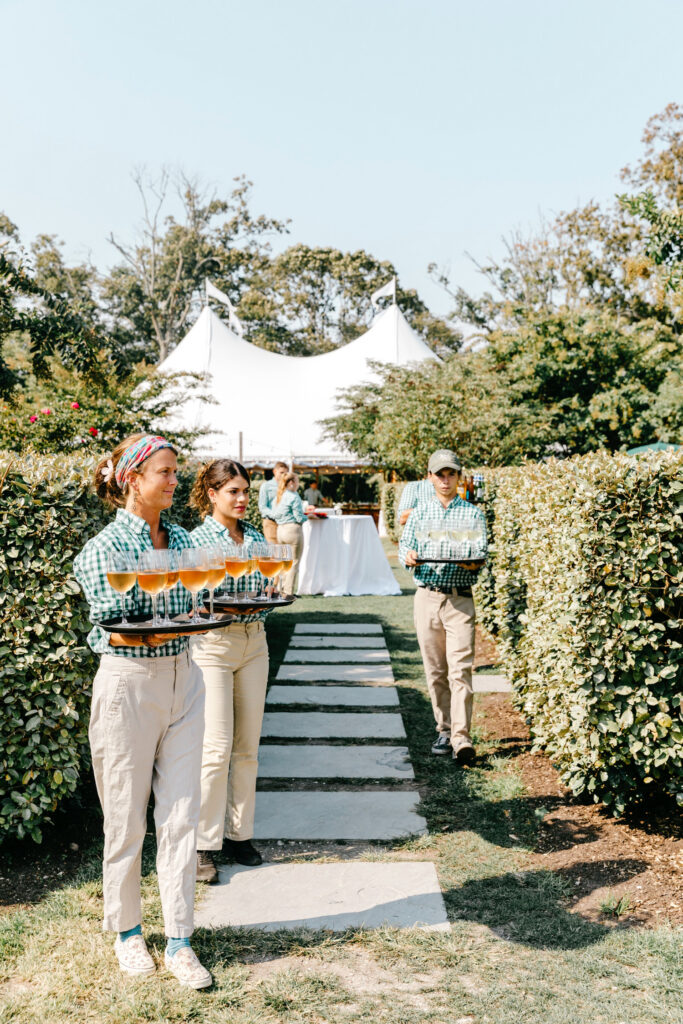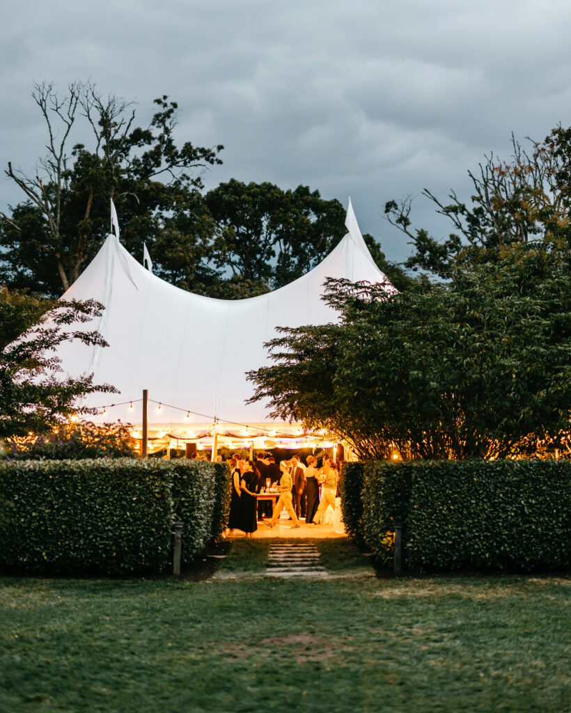 Cocktail hour unfolded in the boxwood gardens just in front of the sail tent, where guests gathered under open skies with views of the farm all around them. The Lobster House joined the celebration to shuck oysters, adding a local, seasonal layer to the experience.