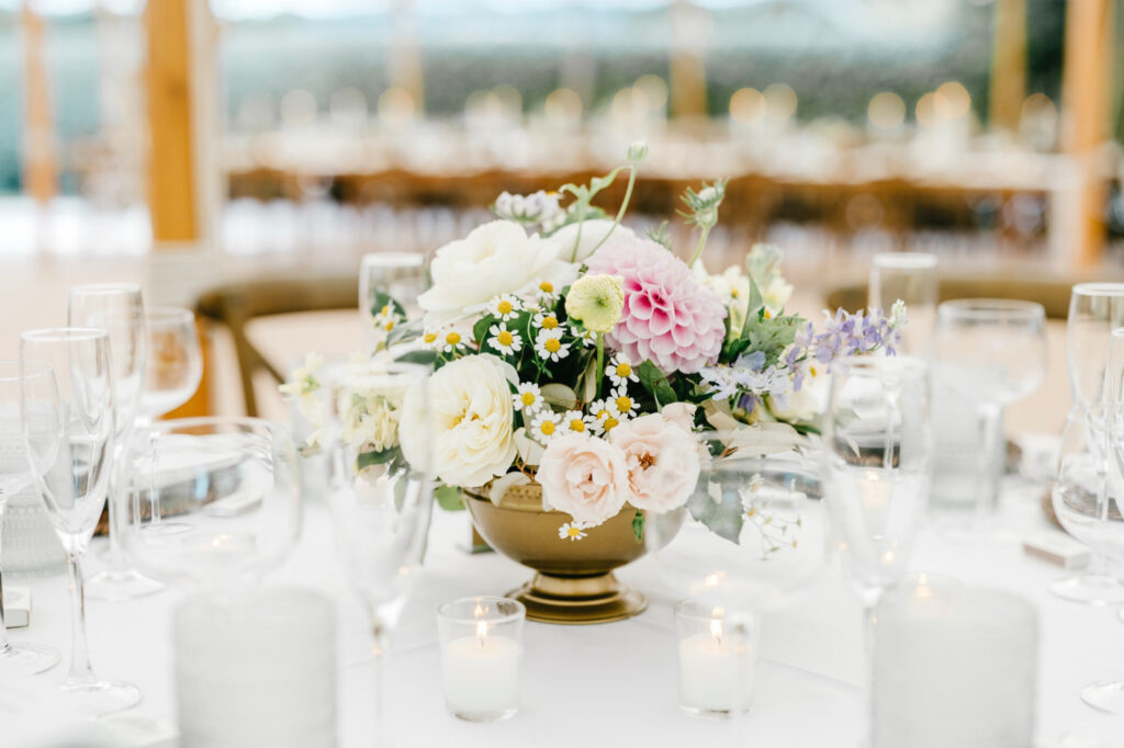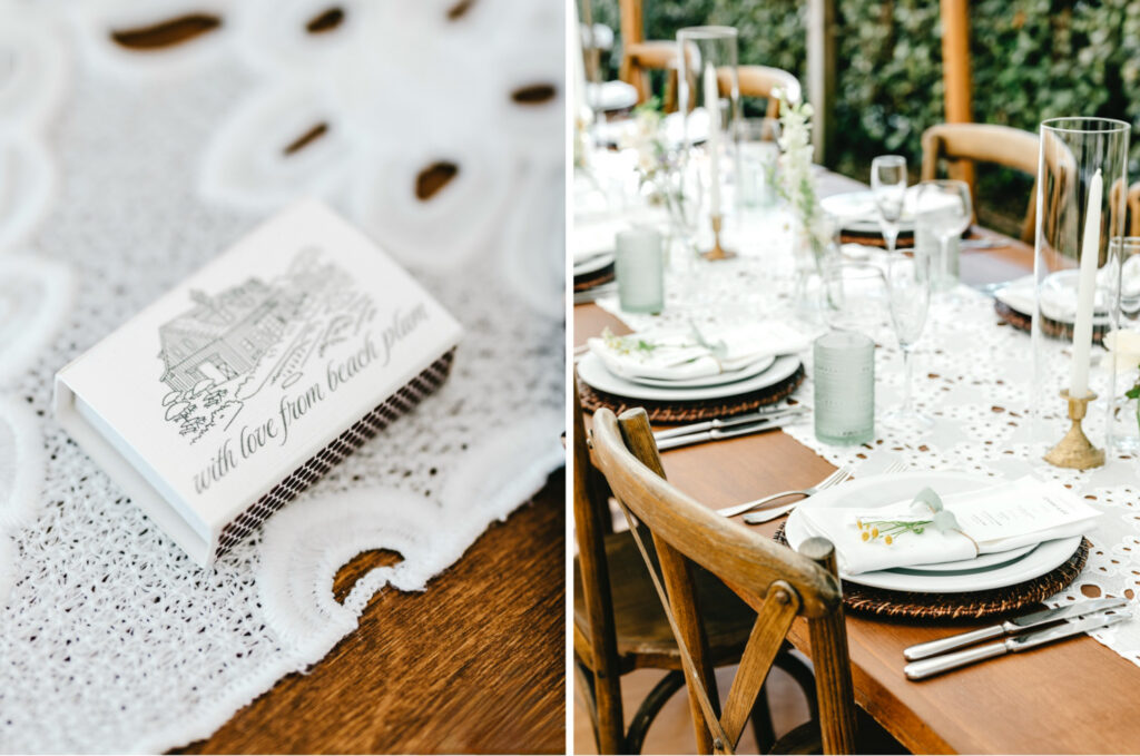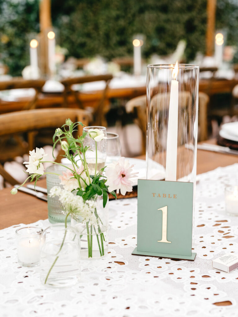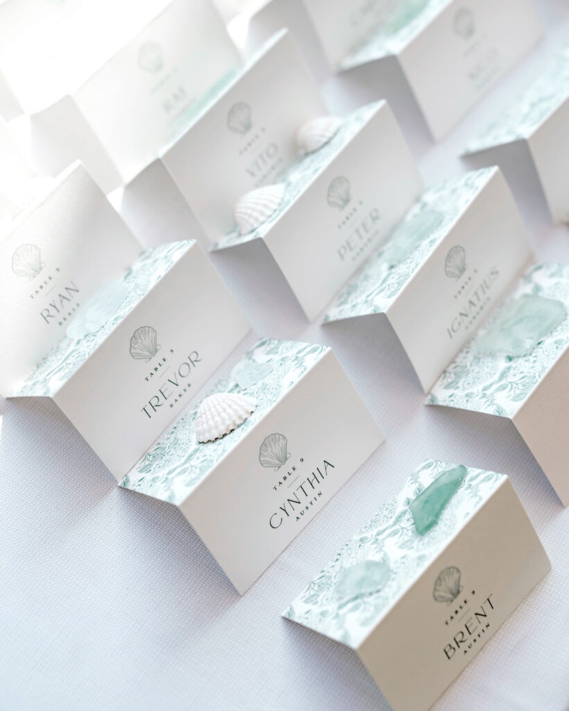 What elevated the space were the details you noticed as you moved through it. Each place setting was finished with a small sprig of chamomile tucked into the menu—a quiet, thoughtful gesture that reflected the care behind every decision. The sea glass escort cards, in subtle shades of green and blue, echoed both the coastal setting and the relaxed elegance of the day.