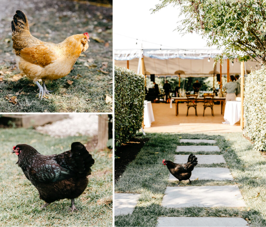 The food mirrored the spirit of the day — beautiful ingredients, simply prepared. Farm-to-table bites were served alongside fresh oysters, and once guests moved into the tent, the farm’s free-range chickens wandered through the gardens, pecking at scraps and adding an unmistakable sense of place.