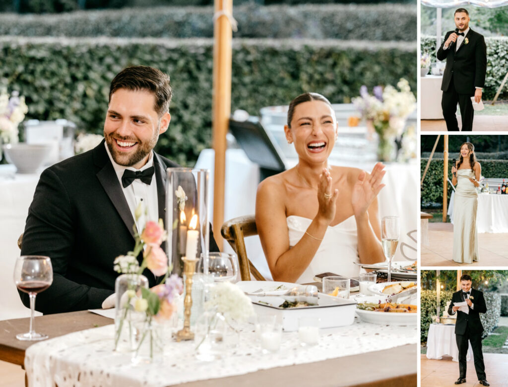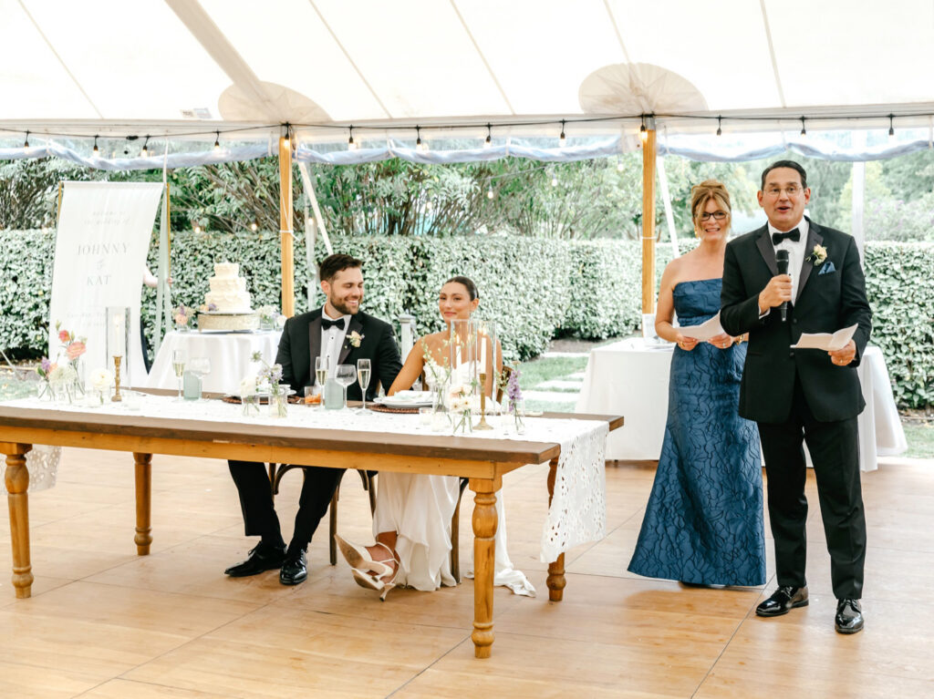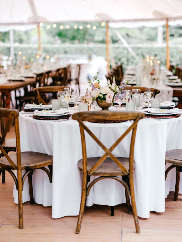 The reception unfolded beneath a classic cloth sail tent, where Musa Weddings brought the design vision to life with a soft, considered hand. The palette stayed light and inviting—pastels layered with natural textures that felt perfectly at home on the farm. Scalloped tablecloths, rattan chargers, sea-glass green water goblets, and long farm tables created a foundation that felt warm and intentional.